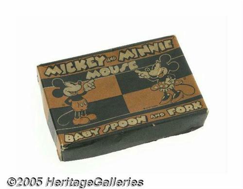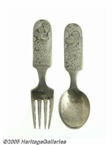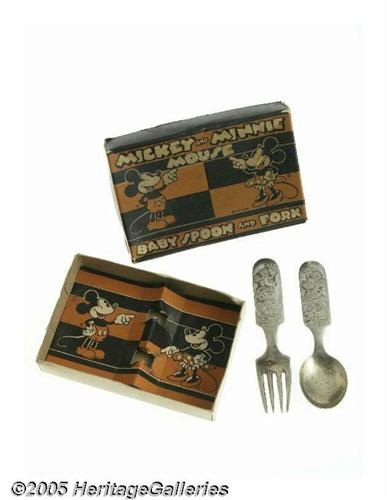 <B>Mickey and Minnie Mouse Baby Spoon and Fork in Box (Fairfield Silverplate, circa 1930s).</B></I> This silverplate baby spoon and fork set was produced by Fairfield Silverplate in the 1930s. The handle of the fork is engraved with an image of Mickey Mouse, and the spoon handle is engraved with Minnie Mouse. The back of each utensil is marked "Fairfield Silverplate". They are both approximately 4" long by 1" wide at the ends. Both of them are in Excellent condition, with a little bit of oxidation apparent. The rare box is exceptionally clean, with little wear. A rare and hard to find item, especially in its original box. <I>From the Larry Jacobs Collection.</B></I>