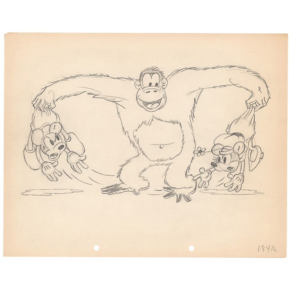 (Walt Disney Studios, 1933) Excellent original production drawing of Mickey and Minnie Mouse and Beppo the Gorilla from the early cartoon The Pet Store, which shows Beppo easily scooping up the mouse couple moments after escaping from his cage. Accomplished in graphite on untrimmed 12 x 9.5 animation paper, marked in the lower right, "184A." Total image measures 10.5 x 5.5. In fine condition.