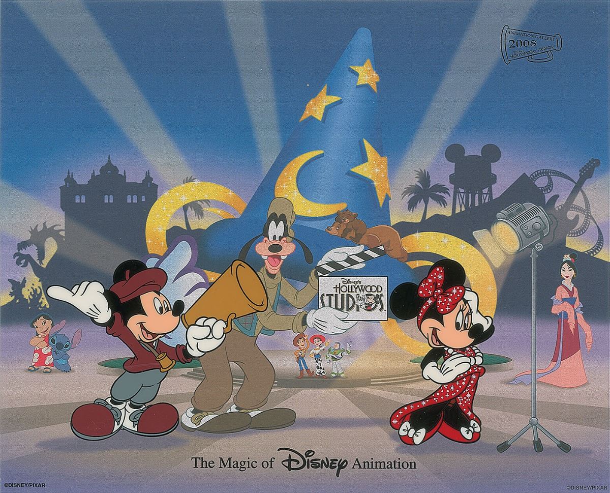 (Walt Disney Studios, 2008) Original limited edition hand-painted cel featuring Mickey and Minnie Mouse on a film set entitled ‘Director’s Choice,’ sold only in 2008 in the Disney-MGM Studios theme park at Disney World. These cels were painted for the ‘Magic of Disney Animation’ series. The cel is placed on a printed color background. Character images measure 4.75 x 3.75 and 2.5 x 4, with overall dimensions of 13 x 10.5. In fine condition.