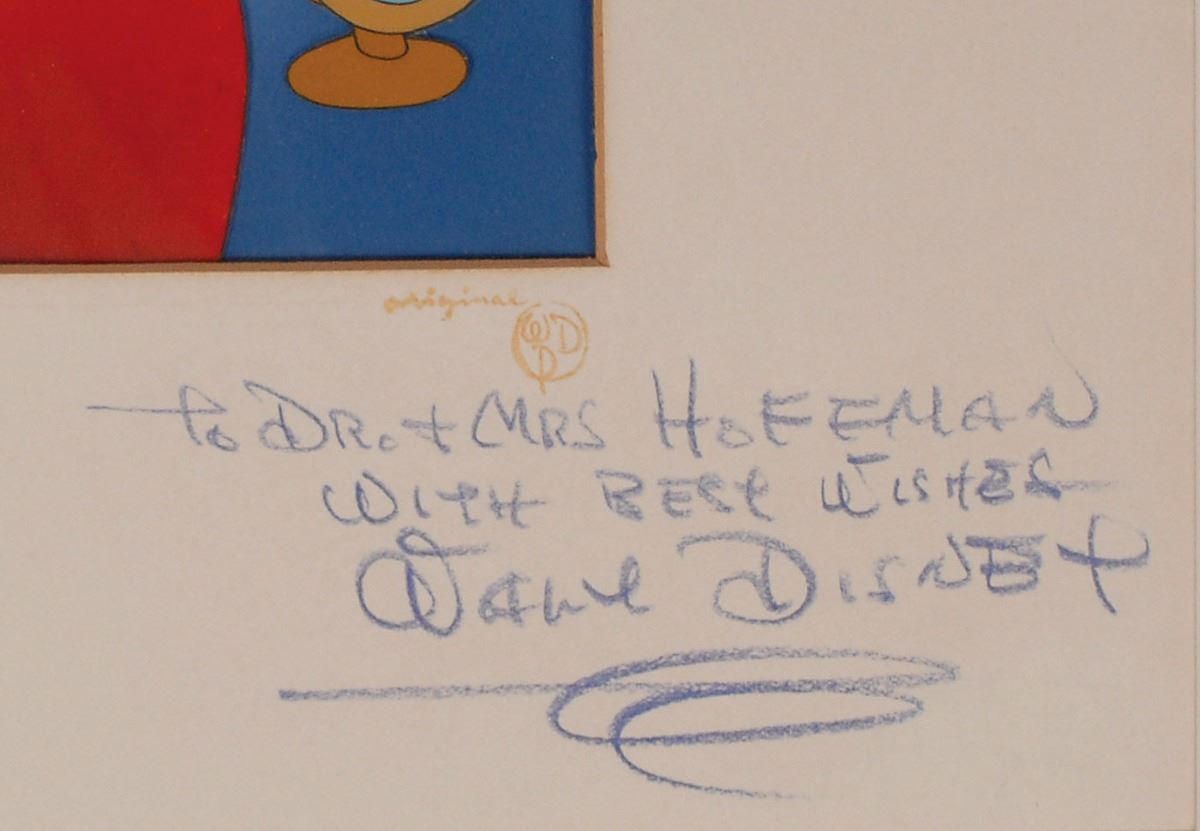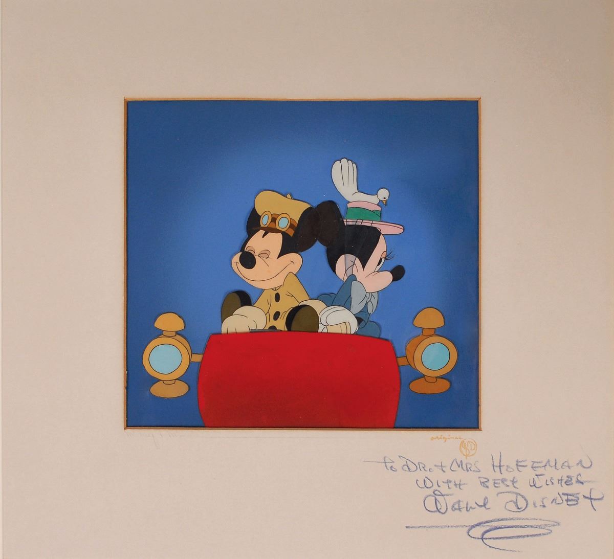 (Walt Disney Studios, 1941) Original production cel featuring Mickey and Minnie Mouse from the Nifty Nineties, showing the pair riding in Mickey’s buggy. The cel has been trimmed and applied to an airbrushed background as prepared by Courvoisier Galleries for sale, signed and inscribed on the mat in purple artist’s crayon, “To Dr. & Mrs. Hoffman, with best wishes, Walt Disney.” Image measures 6.5 x 5.5, with a mat opening of 7.5 x 6.75. Mat dimensions are 17.5 x 16.25. In fine condition, with a trivial spot of toning to cel.
