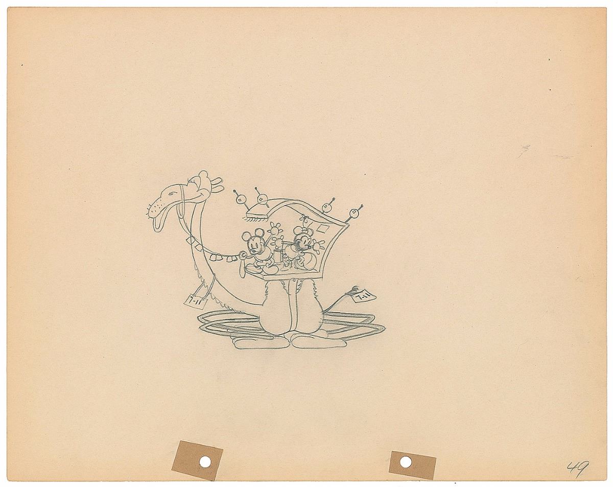(Walt Disney Studios, 1932) Original production drawing featuring Mickey and Minnie Mouse from Mickey in Arabia, showing them happily riding atop a large camel. Accomplished in graphite on untrimmed 12 x 9.5 animation paper. Image measures 5 x 3.75. In fine condition.