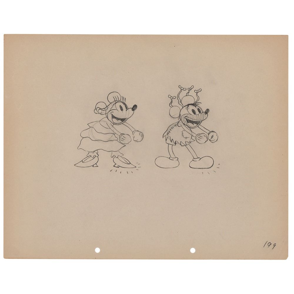(Walt Disney Studios, 1933) Original production drawing of Mickey and Minnie Mouse from Mickey's Mellerdrammer, which depicts the two characters in costume during a dance sequence. Accomplished in graphite on untrimmed 12 x 9.5 animation paper, marked "199" in the lower right corner. Total image measures 6 x 3.5. In fine condition. Mickey's Mellerdrammer focuses on Mickey Mouse, Minnie Mouse, and Goofy (known then as Dippy Dawg) as they attempt to put on a play inspired by Harriet Beecher Stowe's Uncle Tom's Cabin.