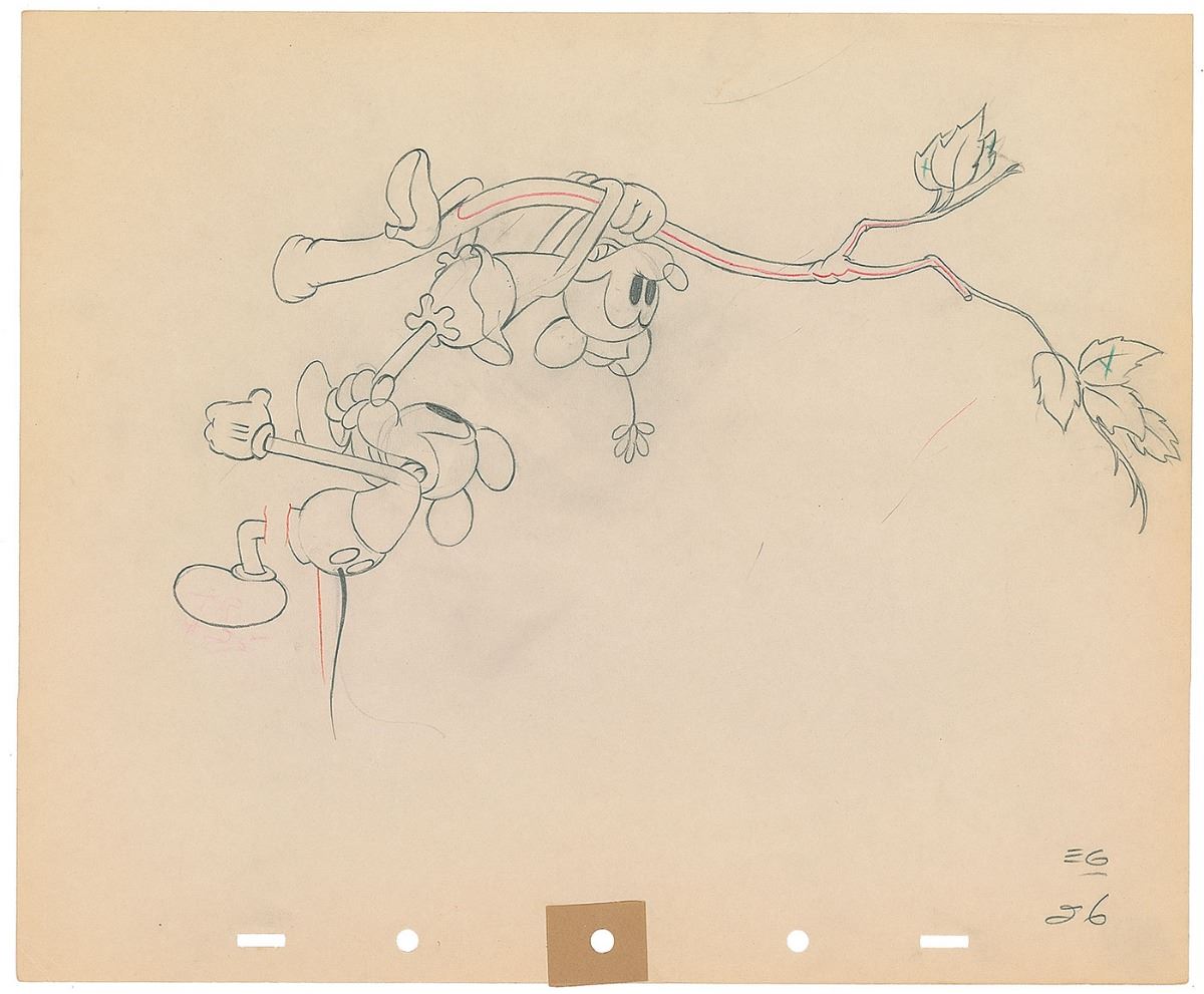 (Walt Disney Studios, 1936) Original production drawing featuring Mickey and Minnie Mouse from Mickey’s Rival, showing the pair dangling from a tree branch, with Mickey desperately clinging to Minnie’s left leg. Accomplished in graphite and colored pencil on untrimmed 12 x 10 animation paper. Total image measures 10.25 x 6.5. In fine condition.