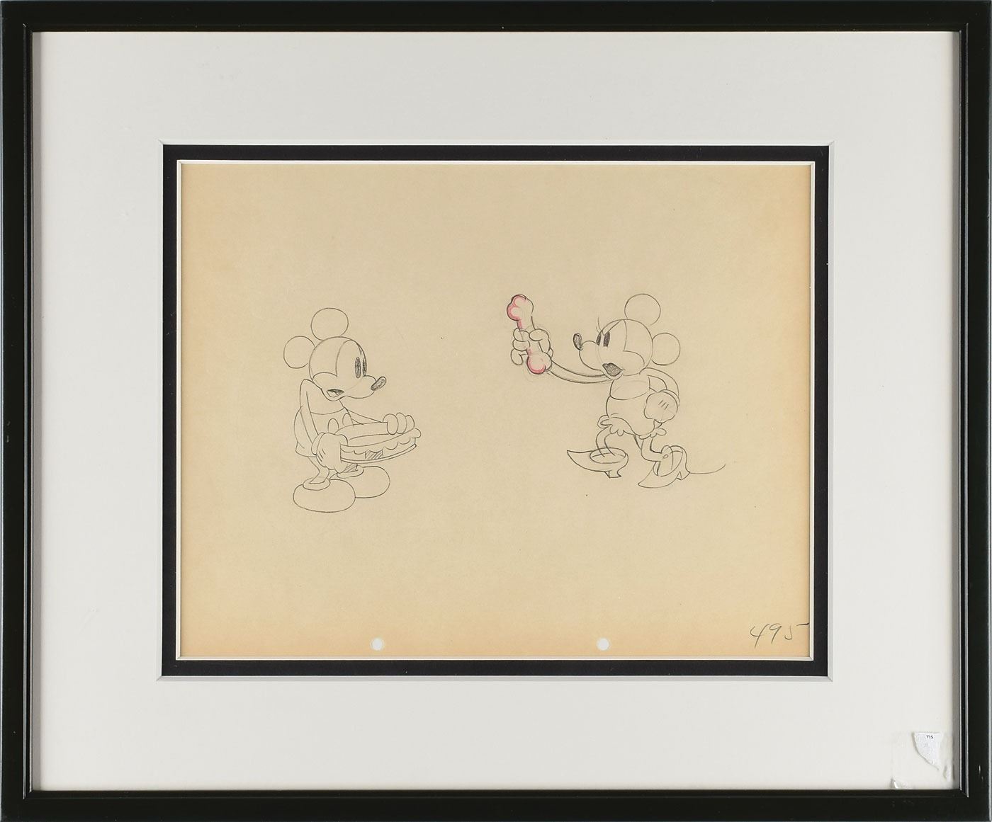 (Walt Disney Studios, 1933) Excellent original production drawing of Mickey and Minnie Mouse from Puppy Love, showing an upset Minnie walking towards Mickey with a large dog bone, and the latter appearing shocked and holding an empty heart-shaped box, which at one point contained chocolates. Marked "495" in the lower right corner. Accomplished in graphite and colored pencil on untrimmed 11.25 x 8.75 animation paper. Images measure 2.5 x 3.75 (Mickey) and 4 x 3.5 (Minnie). Double-matted and framed to an overall size of 17.5 x 14.5. In fine condition.