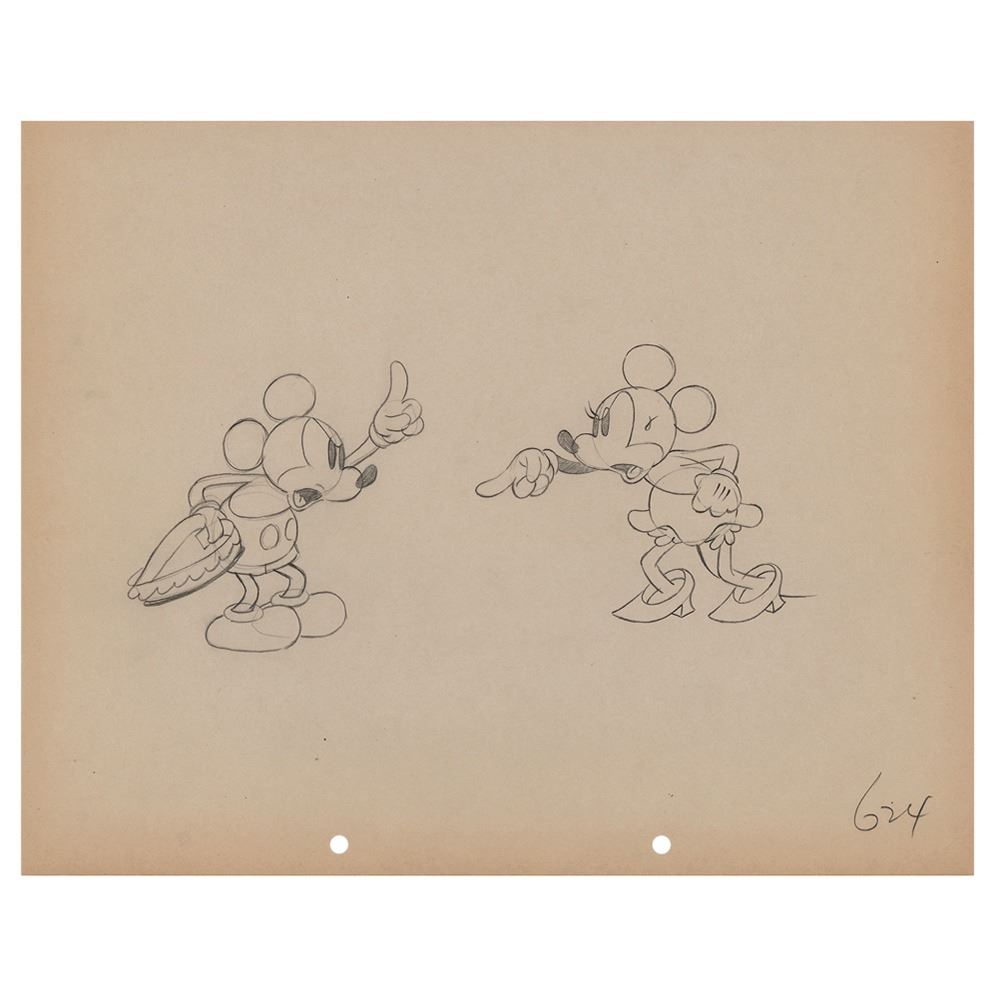 (Walt Disney Studios, 1933) Original production drawing of Mickey and Minnie Mouse from Puppy Love, which shows the quarreling mice in full-figure poses, and an empty heart-shaped box in Mickey's right hand. Accomplished in graphite on untrimmed 12 x 9.5 animation paper, marked "624" in the lower right corner. Images measure 3.75 x 3.5 (Mickey) and 3.75 x 3.5 (Minnie). In fine condition.