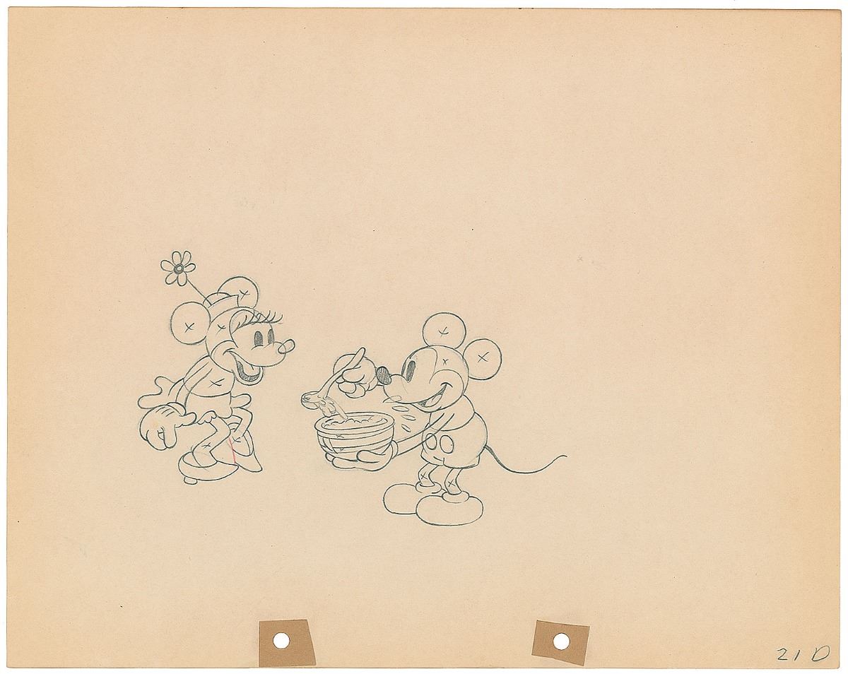 (Walt Disney Studios, 1932) Original production drawing from The Klondike Kid, showing Mickey about to spoon-feed Minnie some hot soup. Accomplished in graphite on untrimmed 12 x 9.5 animation paper. Total image measures 6 x 4. In fine condition.