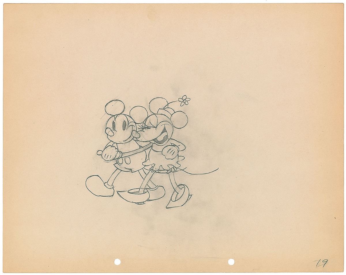(Walt Disney Studios, 1933) Original production drawing from The Pet Store, showing Mickey and Minnie Mouse walking hand-in-hand. Accomplished in graphite on untrimmed 12 x 9.5 animation paper. Total image measures 4.75 x 3.75. In fine condition.