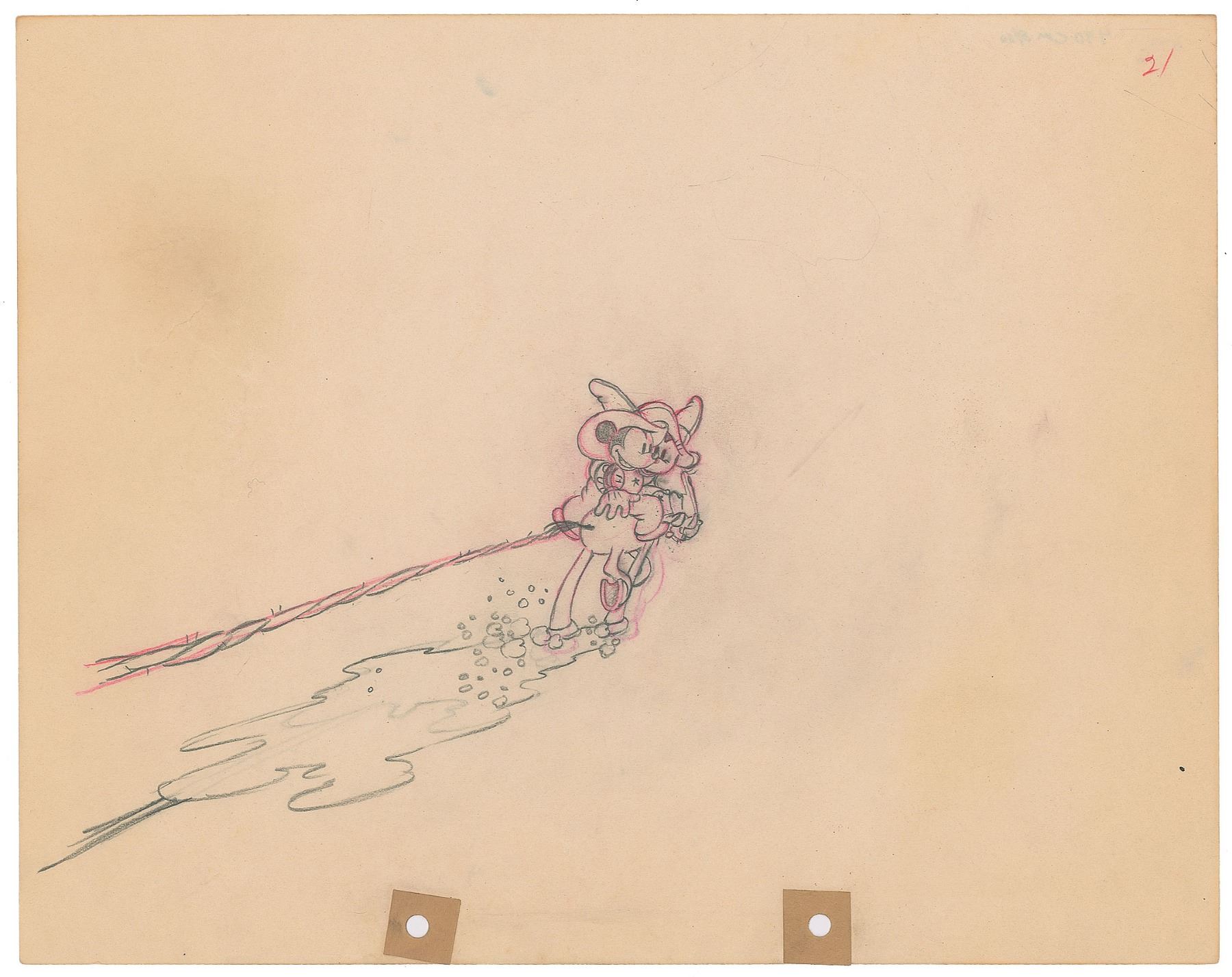 (Walt Disney Studios, 1934) Original production drawing featuring Mickey and Minnie Mouse from Two-Gun Mickey, showing them together on horseback with a long rope trailing behind them, used to tow Pegleg Pete after he is captured. Accomplished in graphite and colored pencil on untrimmed 12 x 9.5 animation paper, marked "21" in the upper right. Total image measures 6.5 x 5. In fine condition.