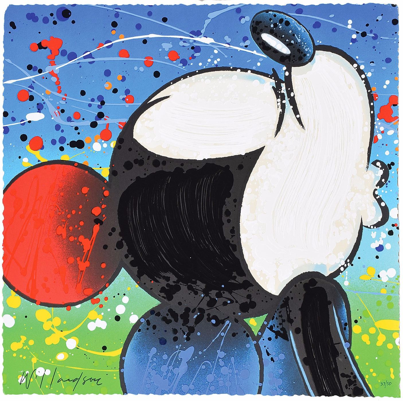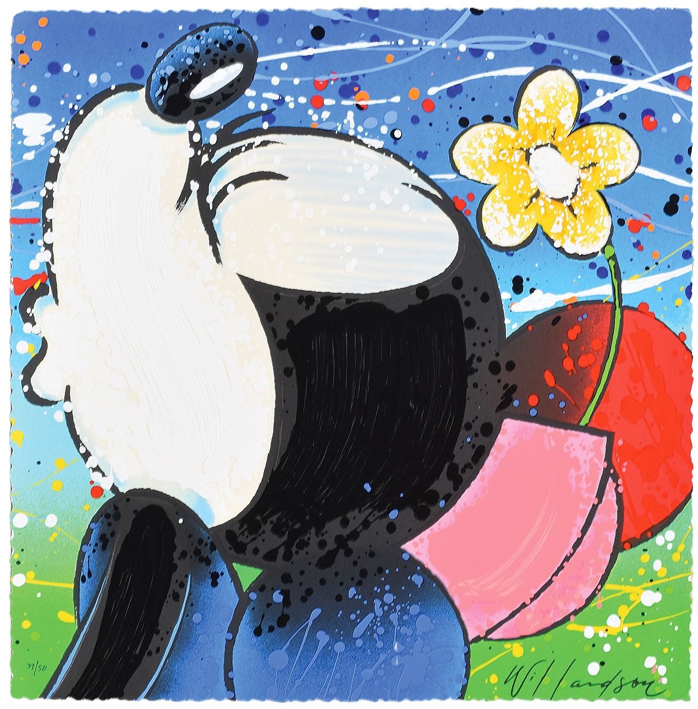 Sought-after matched set of color limited edition 18 x 18 serigraphs of Mickey Mouse and Minnie Mouse kissing by David Willardson, entitled 'Lovey and Dovey,' each numbered 37/50 and signed in black ink, "Willardson." In fine condition.