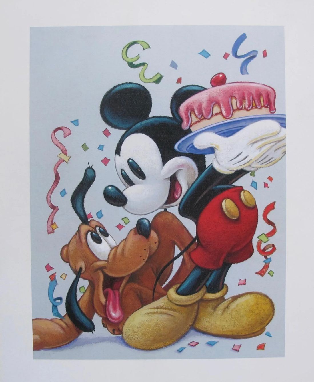 Mickey and Pluto Birthday Cake Lithograph. This is the same image as a 2004 U.S. postage stamp. Paper measures: 14 inches x 11 inches. Image measures 9 inches x 6.5 inches. Comes unframed.