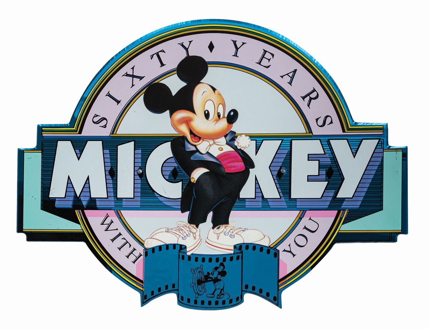 (Disneyland, 1988) A rare lamppost sign from Main Street that was used during Mickey Mouse's 60th birthday celebrations. Printed on acrylic board with mirrored design elements, the sign features a dapper Mickey Mouse with his name behind him and the phrase "Sixty Years with You.” The die-cut sign measures 15"x19" and is in good condition with some scuffing and scratching from use.