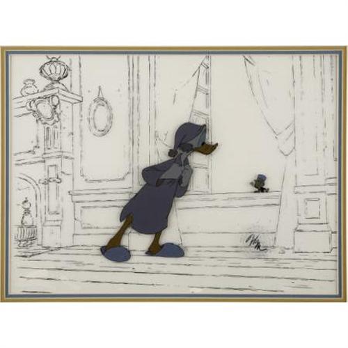 <B>"Mickey's Christmas Carol" Scrooge McDuck and Jiminy Cricket Animation Production Cel Original Art (Walt Disney, 1983).</B></I> Scrooge McDuck is visited by Jiminy Cricket as the Ghost of Christmas Past, in this hand-painted cel and presentation background from "Mickey's Christmas Carol." This cel has an image area of 14.5" x 10.5", and is in Excellent condition. Includes a Disney seal at the lower right.<BR><BR><b>Shipping:</b> Framed - with Glass, Medium (<a target="_blank" href="http://www.heritageauctions.com/common/shipping.php">view shipping information</a>)