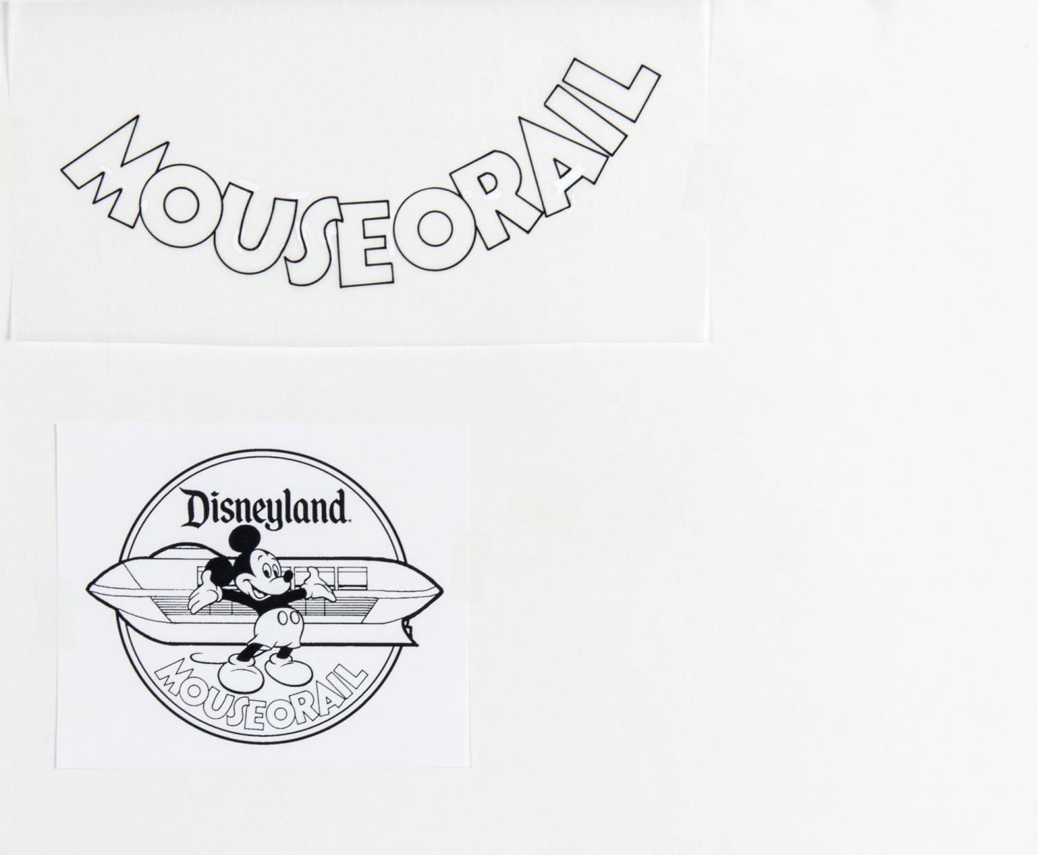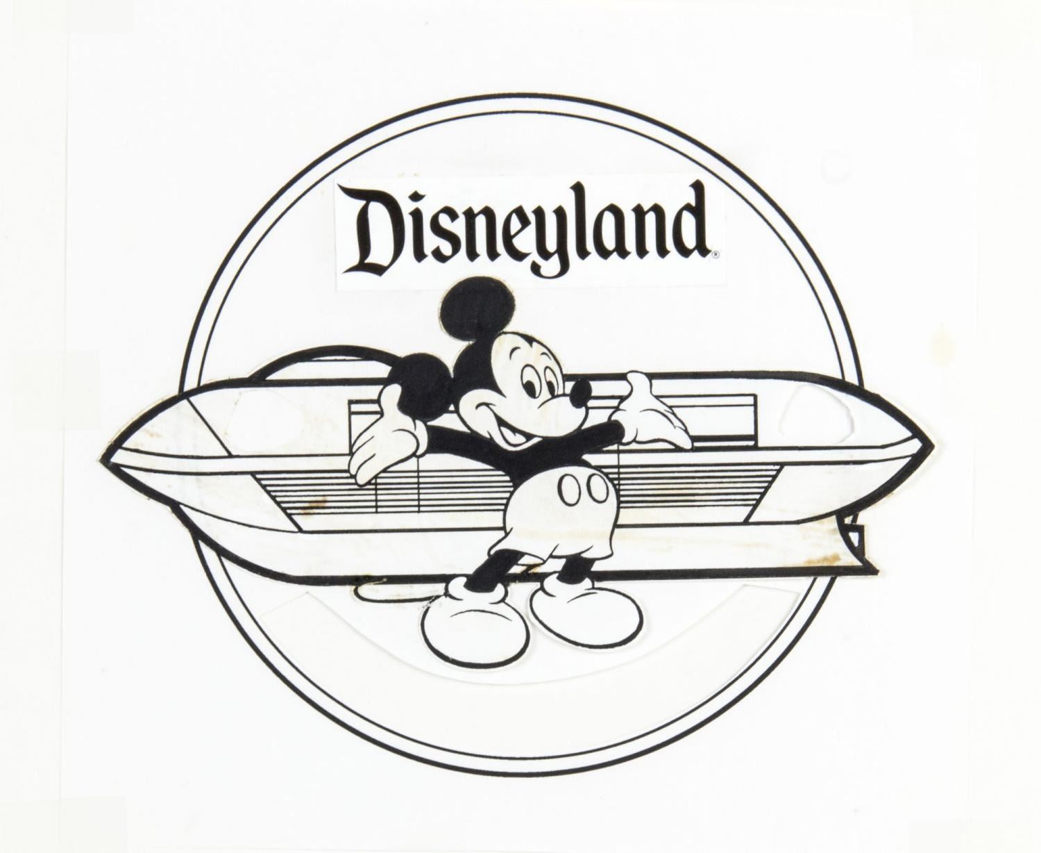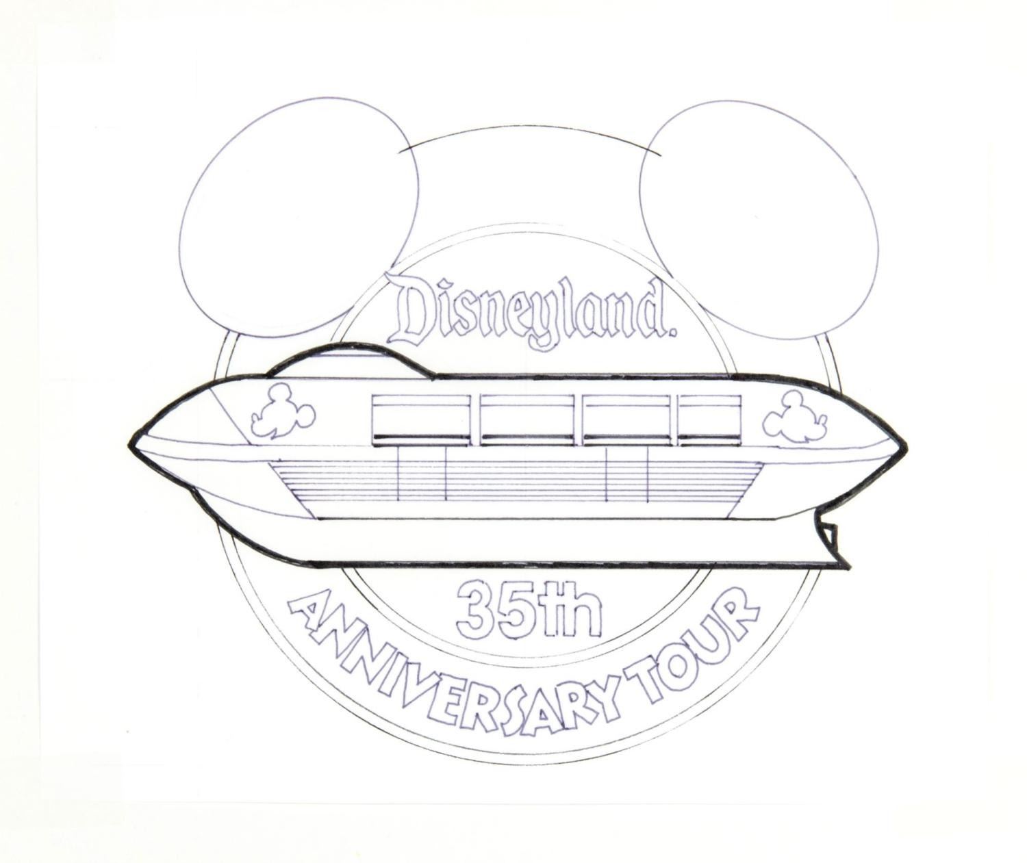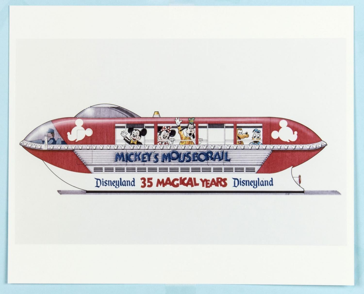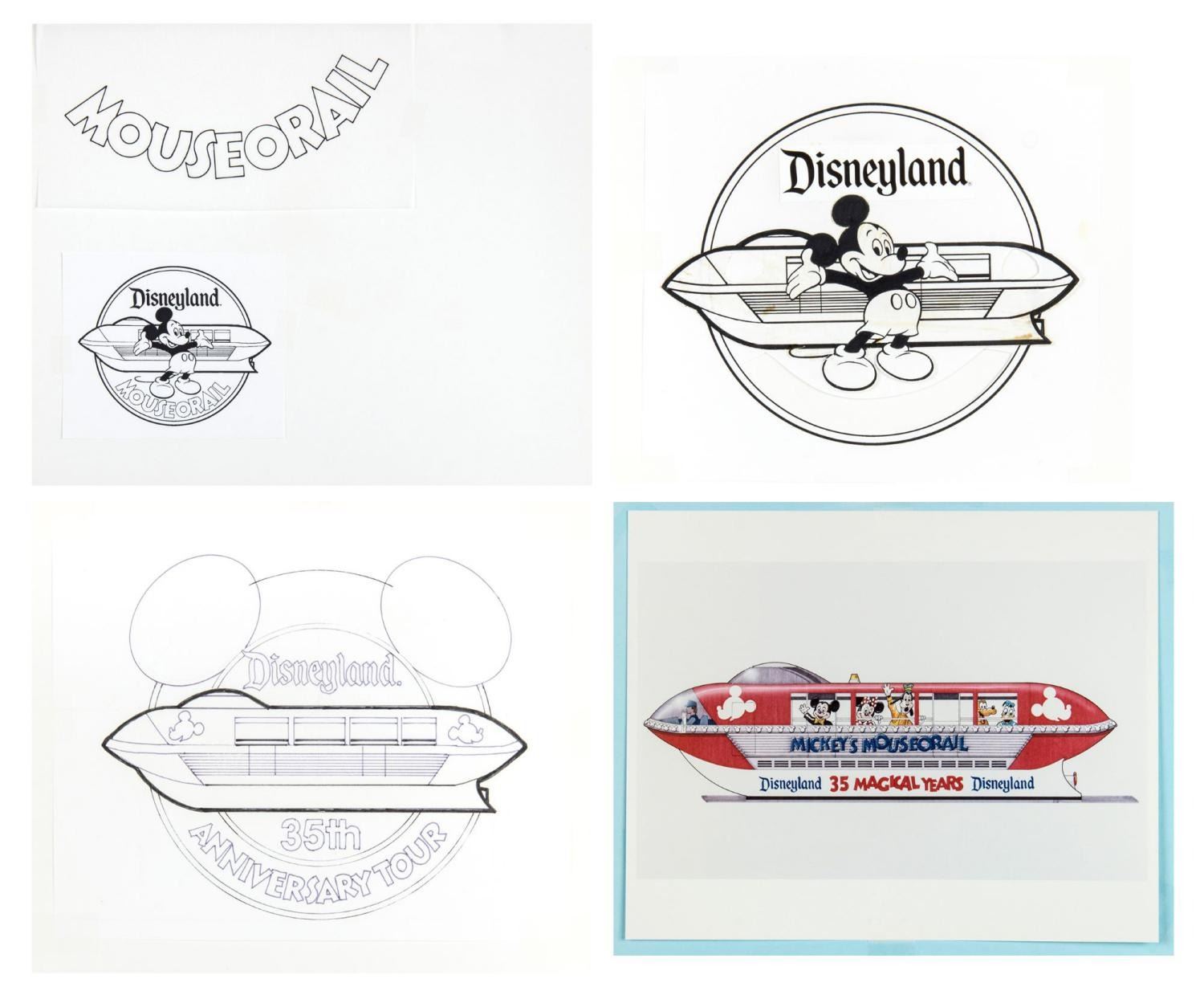 (Disneyland, 1988) Four pieces of development art for the Mickey Mouseorail pin. The Mouseorail was a Monorail vehicle converted into a bus that toured multiple cities to promote Disneyland and its 35th anniversary. With image sizes ranging from 3.25” x 4” to 7” x 8” on 9.5” x 11.5” construction paper, the items are in good to very good condition with stains and typical wear from production use.