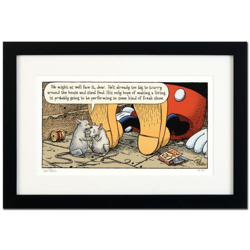 Enter a surreal and satirical world of twisted imagination and award winning creativity. "Mickey's Parents" is a limited edition giclee on paper by Dan Piraro, creator of the critically acclaimed and award winning comic strip, Bizarro! This piece is framed, numbered and hand signed by the artist! Includes Certificate of Authenticity! Measures approx. 22" x 15" (with frame), 15" x 8" (image).