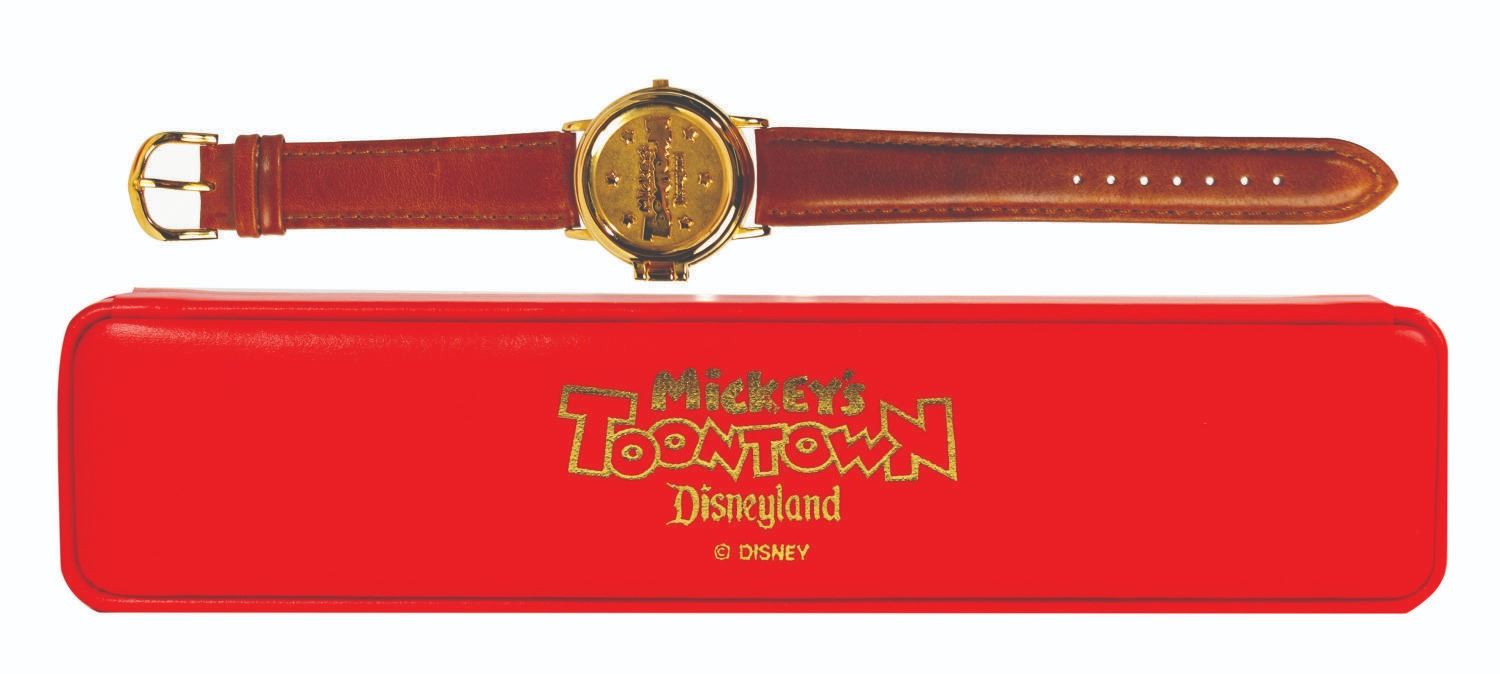 (Disneyland, 1993) A novelty wristwatch celebrating the opening of Mickey's Toontown at Disneyland. When a button on the gold-tone case in pressed, the front cover opens and the watch face pops up on a spring, with artwork of Mickey and friends on the face. The back of the case is engraved "Commemorating the Opening of Mickey's Toontown." The original red leather clamshell box is included. Measuring 1.5" in diameter and 9" long with the leather band, the watch is in fine condition. The front cover of the watch case exhibits some rubbing to the relief features. The watch does not currently function and likely requires a new battery. The box measures 9.75"x2.25" and 1.25" deep and is as-new.
