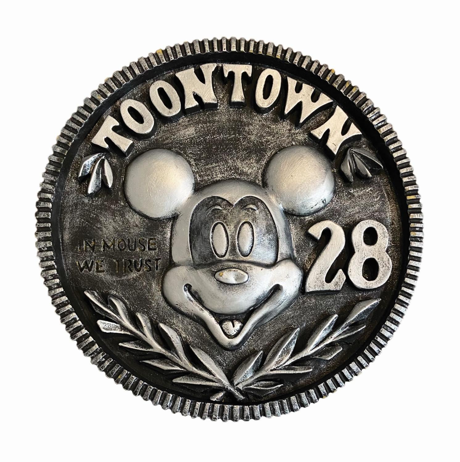 (Disneyland, 2003) An oversized prop coin from Mickey's Toontown in Disneyland. The cast resin coin is hand-painted in antiqued metallic silver and features a central relief image of Mickey Mouse with a numeral 28 (in honor of the year of his film debut), "Toontown" lettering, and laurel branches. Recessed lettering at right reads, "In Mouse We Trust." The prop coin was used as a decor element in the cartoon themed park land. Measuring 14.75" in diameter and 1" deep, the piece exhibits some spots of paint loss on the face, and more pronounced scratches and strips of paint loss to the reverse, with some paper remnants, resulting from prior park display.