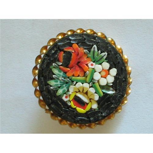 A very lovely and beautifully hand made micro mosaic brooch / pin, round in shape with a design of flowers in reds and yellow gold colours with green leaves on a black background - very pretty and colorful. The backing is gold tone, possibly brass, and stamped Italy.