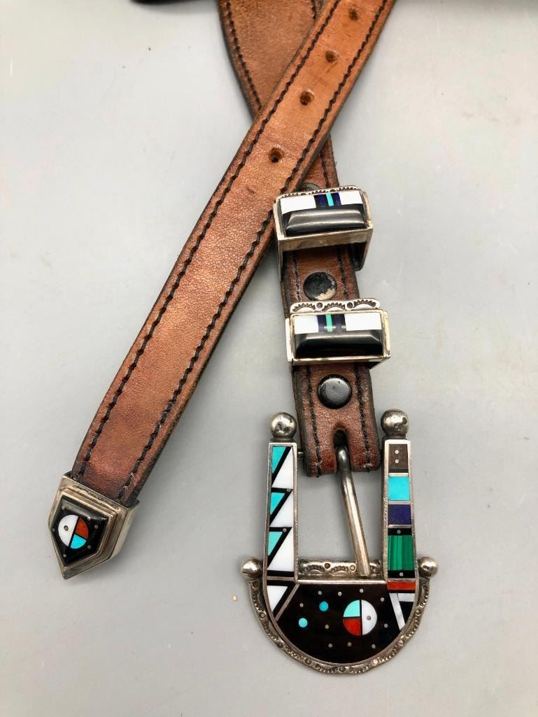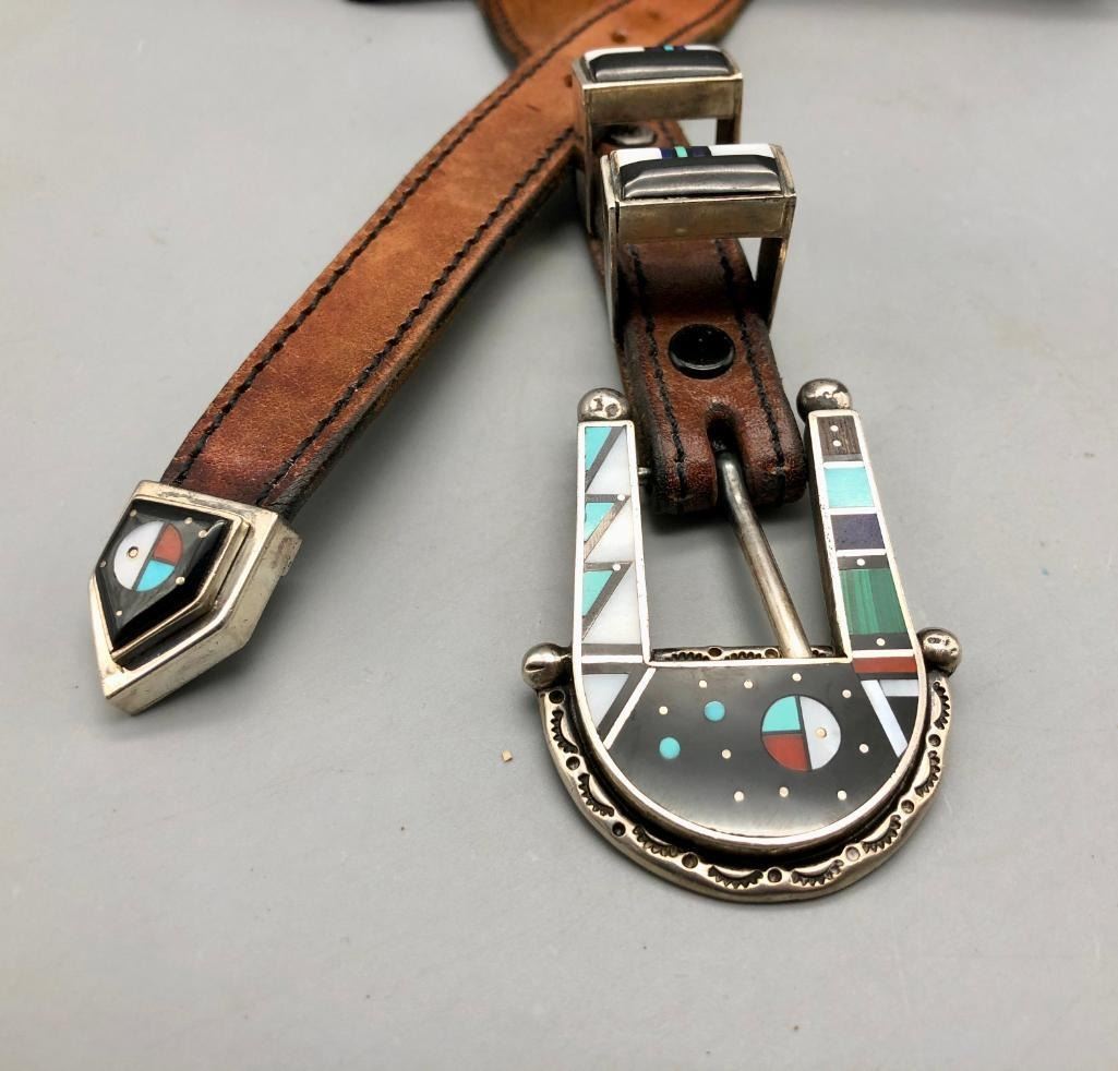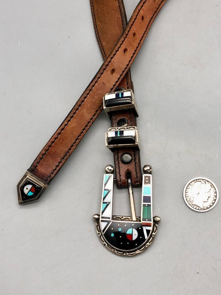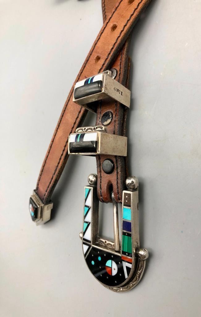 Presented for sale in this lot is a stunning micro inlay four piece buckle set. This is a well crafted piece with a gorgeous inlay design set with turquoise, shell, onyx, and other stones and accented with silverwork in between. It is on a nice supple leather belt that appears to be made for this particular buckle set. It is made from sterling silver. MAKER: H. Smith. Harold Smith (Navajo). APPROX AGE: Circa Contemporary. SIZE: Belt measures 41 inches long X 1-1/4 inches wide. Buckle measures 2-1/2 inches wide X 1-7/8 inches wide. Weighs 152.5 grams. CONDITION: Good for its age, normal wear expected. Please look closely at the pictures as they are an important part of our description and are hereby incorporated into the description, specifically with regards to condition. SHIPPING: There will be a $5 handling / packaging fee for shipping this lot. The actual cost of postage will be added on top of that. BUY IT NOW: If you would like to buy this item now, without waiting for the auction day to bid on it, we do offer this option (which is available up to 48 hours before the actual auction starts). The “Buy it Now†price is the high estimate of this lot (plus applicable fees and the Buyer's premium is discounted to 10% when using the Buy it Now option). If you would like to exercise this option, you must contact us by email (or phone as long as you talk to someone live). Reference this lot number and your intention to "Buy it Now."