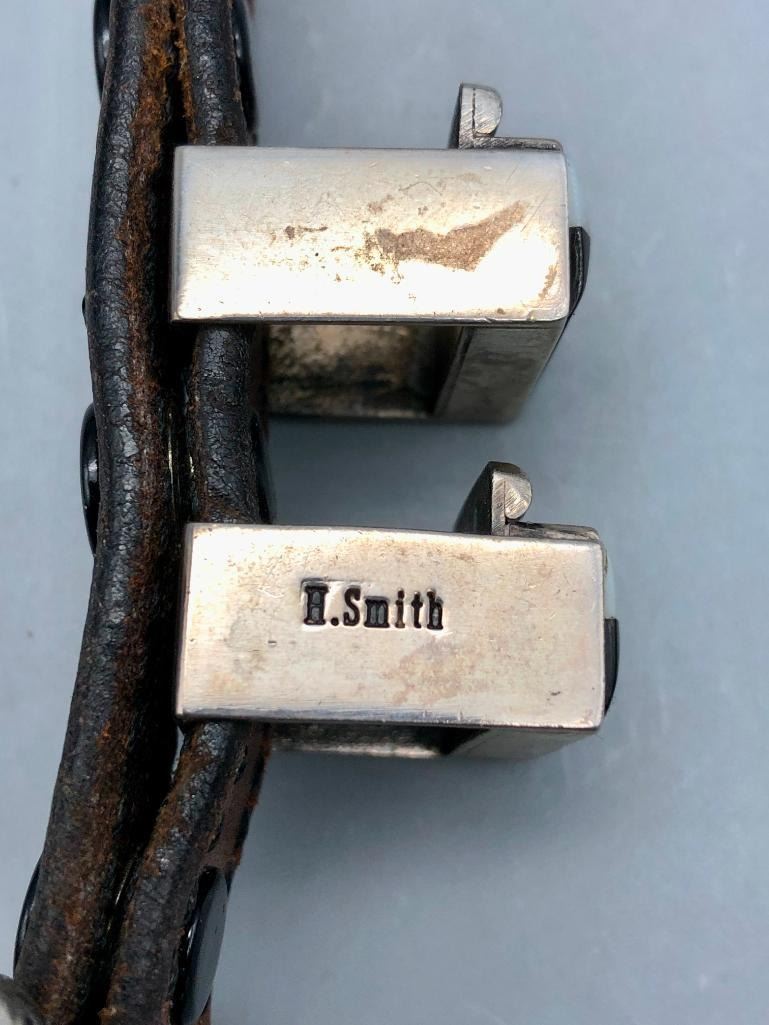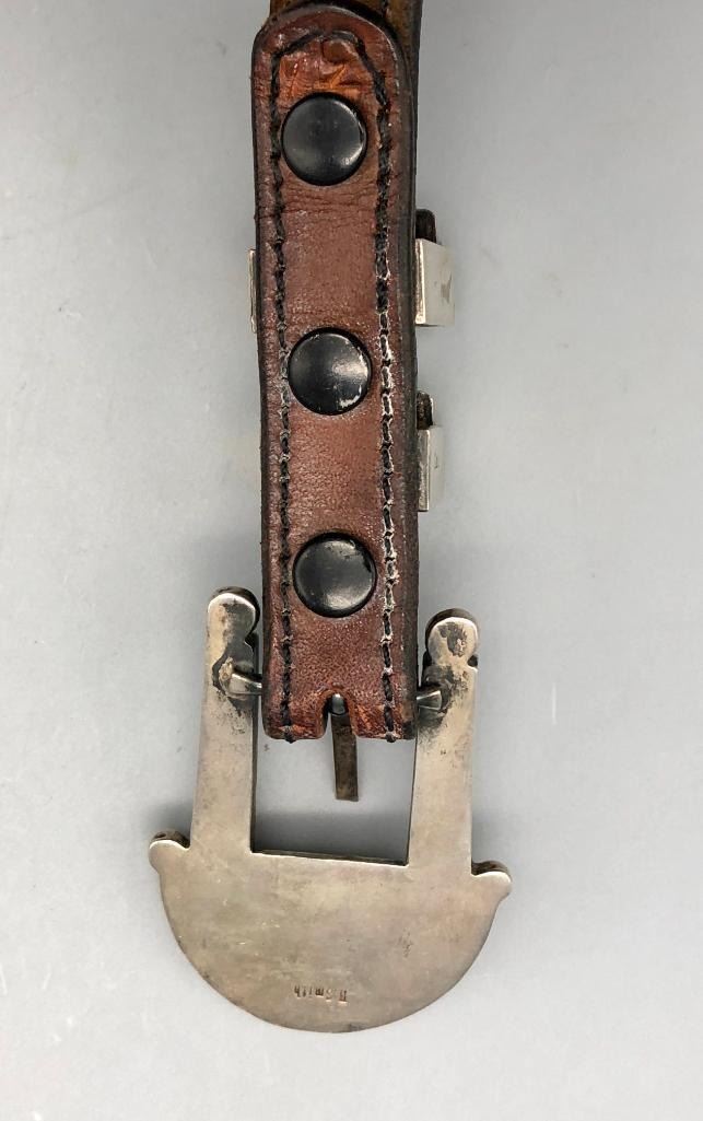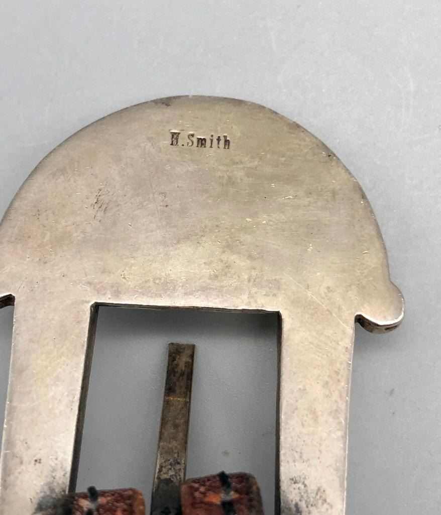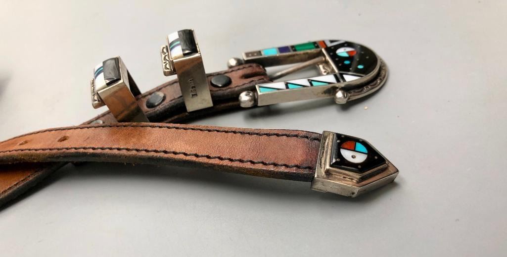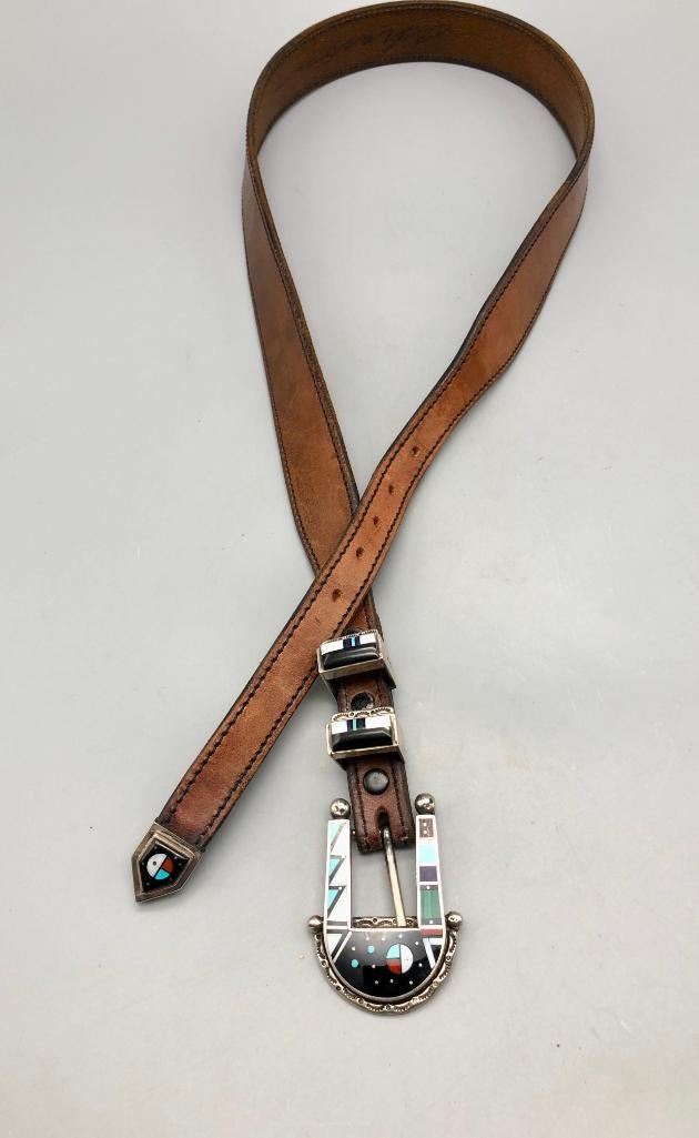 Presented for sale in this lot is a stunning micro inlay four piece buckle set. This is a well crafted piece with a gorgeous inlay design set with turquoise, shell, onyx, and other stones and accented with silverwork in between. It is on a nice supple leather belt that appears to be made for this particular buckle set. It is made from sterling silver. MAKER: H. Smith. Harold Smith (Navajo). APPROX AGE: Circa Contemporary. SIZE: Belt measures 41 inches long X 1-1/4 inches wide. Buckle measures 2-1/2 inches wide X 1-7/8 inches wide. Weighs 152.5 grams. CONDITION: Good for its age, normal wear expected. Please look closely at the pictures as they are an important part of our description and are hereby incorporated into the description, specifically with regards to condition. SHIPPING: There will be a $5 handling / packaging fee for shipping this lot. The actual cost of postage will be added on top of that. BUY IT NOW: If you would like to buy this item now, without waiting for the auction day to bid on it, we do offer this option (which is available up to 48 hours before the actual auction starts). The “Buy it Now†price is the high estimate of this lot (plus applicable fees and the Buyer's premium is discounted to 10% when using the Buy it Now option). If you would like to exercise this option, you must contact us by email (or phone as long as you talk to someone live). Reference this lot number and your intention to "Buy it Now."