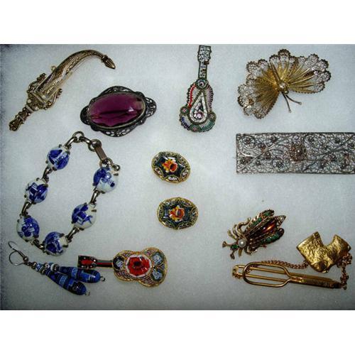Vintage Costume Micro Mosaic brooch Bracelet Earrings, with super filigree work. Nice old lot. CONDITION: Very good.