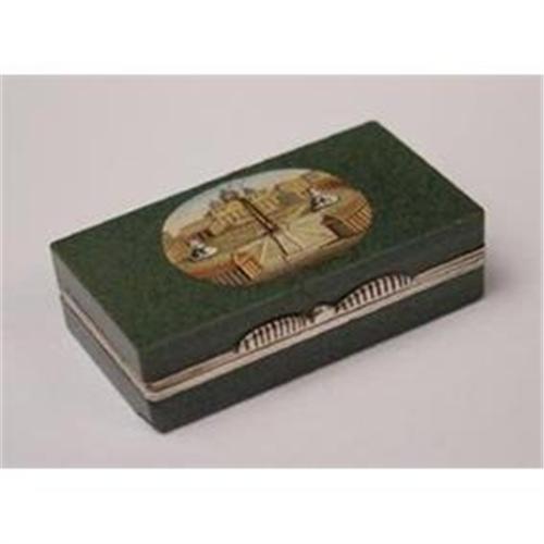 Rectangular olive green snuff box decorated with a micro mosaic architectural image of The Vatican's St. Peters square. The box has silver trim, hinges and latch. It is hallmarked on both outer edges of raised silver rim, on one side with a pair of crossed-keys corresponding to the Coat of Arms of The Vatican City, and on the other hard-to-read numbers (possibly indicating silver content). In the 19th Century, the Papal workshop excelled in a technique called mosaico minuto and produced portrait medallions that rivaled the quality of 18th Century miniature portraits as well as tables and snuff boxes decorated with encrusted mosaics. Micro mosaic objects were sought after by 19th Century foreign visitors making the Grand Tour of Europe. Stone box has minor losses and lid stone has center crack where mosaic pieces have separated and mosaic on one side of obelisk is missing. Please ask questions, request additional photos and shipping costs before buying.
