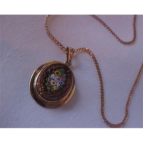 This pretty piece is late 19th century Italian mosaic, set in gold fill on a 14K gold chain. The size is about 3/4" and the condition is perfect.