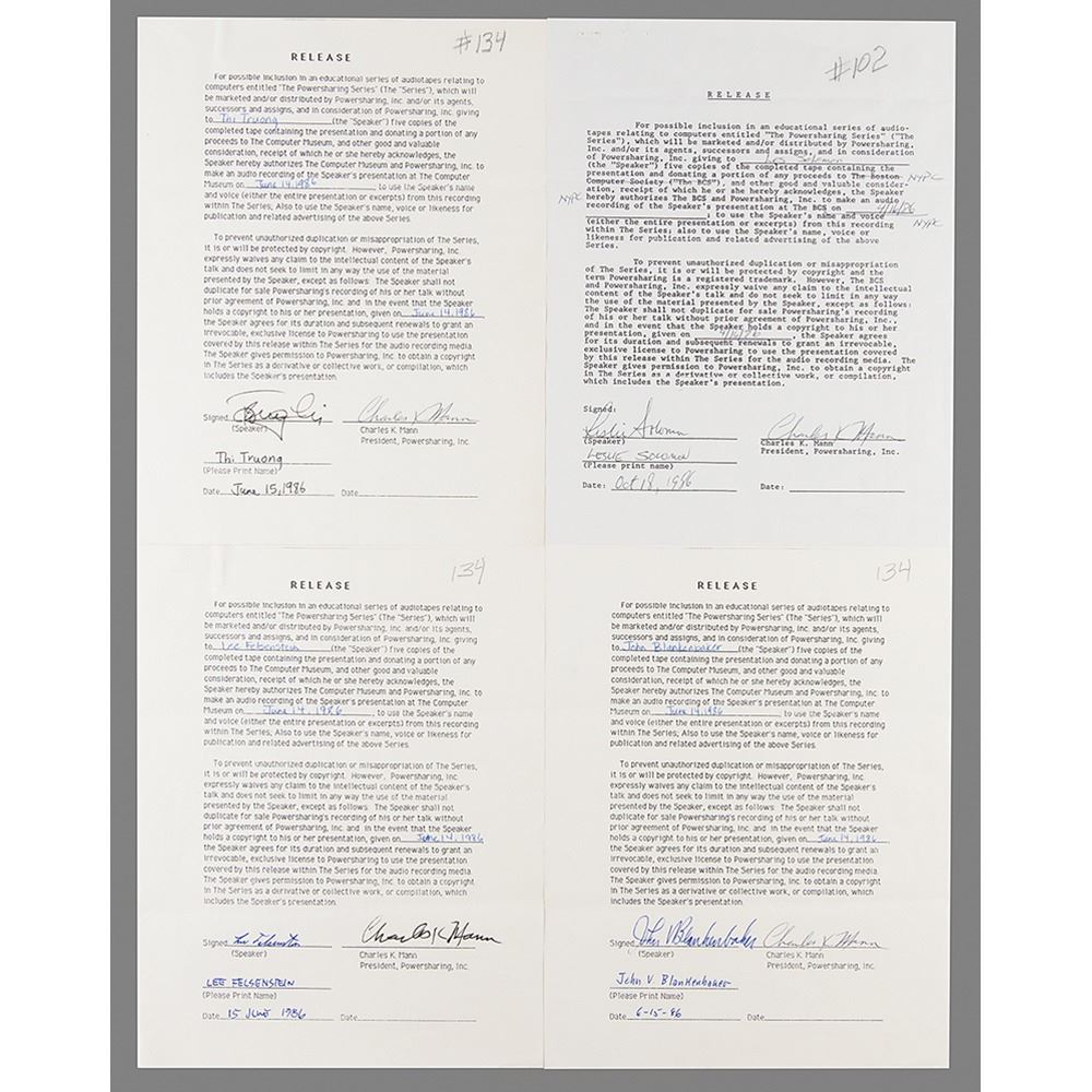 Four documents signed by influential personal computer hardware pioneers, each one page, 8.5 x 11, dated 1986, all being releases for Charles Mann's 'Powersharing Series.' Signers are: John V. Blankenbaker, creator of the Kenbak-1, considered to be the world's first 'personal computer'; Lee Felsenstein, designer of the Intel 8080-based Sol-20, the first fully assembled microcomputer with a built-in keyboard and television output; Les Solomon, the editor of Popular Electronics, ideator and namesake of the Sol-20; and André Truong Trong Thi, a 'father of the personal computer' as co-creator of the Micral N. Each is signed in ink in cursive and print by the subject, and countersigned by Mann. In overall fine condition. Accompanied by the original mailing envelope for Solomon's release form, and a fifth document signed by Robert Pond, who evidently spoke as part of the panel with Blankenbaker, Felsenstein, and Truong.