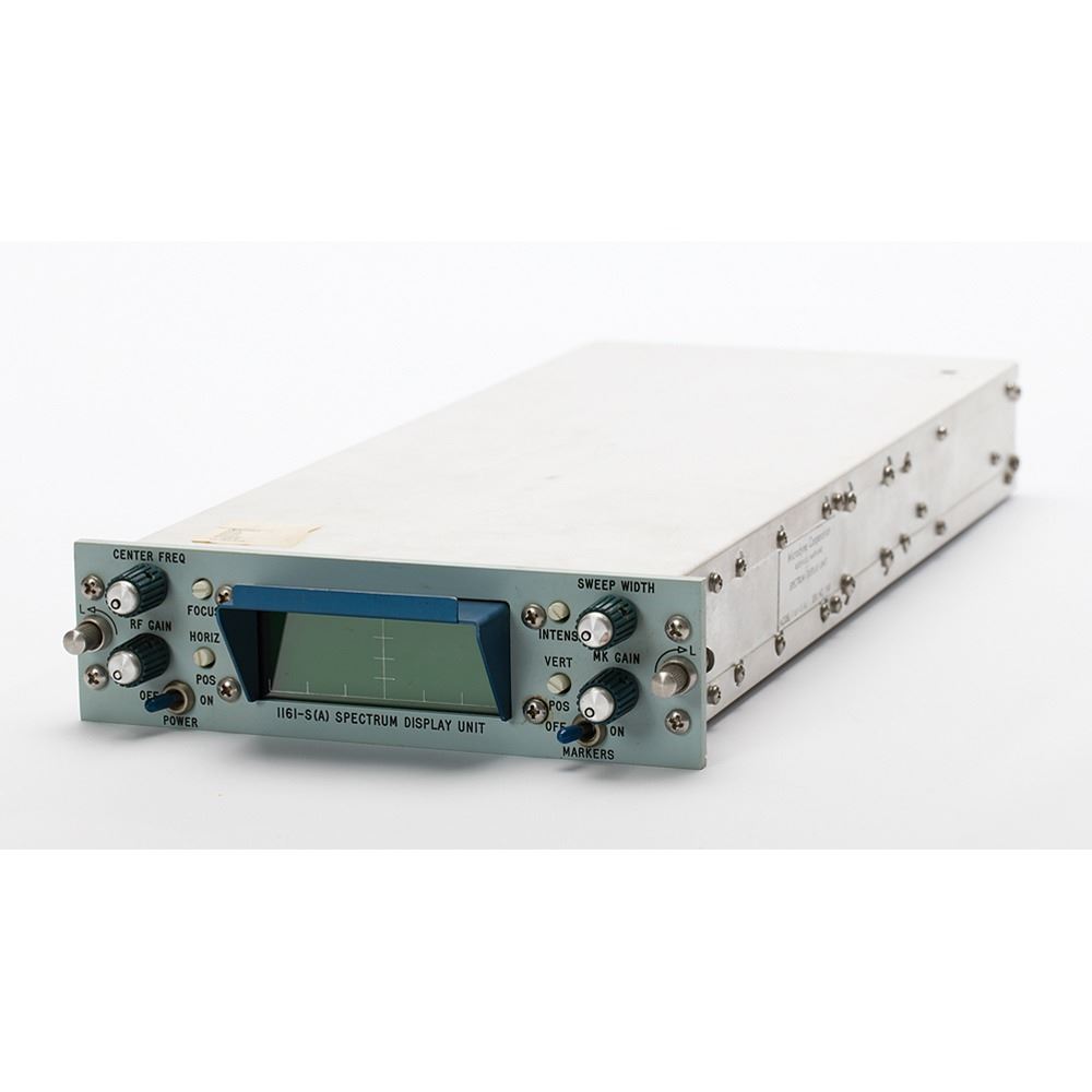 Microdyne 1161-S(A) Spectrum Display Unit for a telemetry receiver, measuring 7Àù x 2Àù x 16.5Àù, marked on the side as "Ser. No. 518." The front panel features a display flanked by knobs to control frequency, gain, and sweep width. In fine condition.