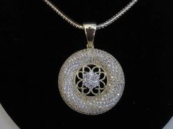 Micropave Pendant 1.5" Diameter with 7 Round clear CZ's forming Star of David in Center on Gold Electroplated 3 mm Round Fox Chain Necklace 16" + 2" Extension in Red Gift Pouch