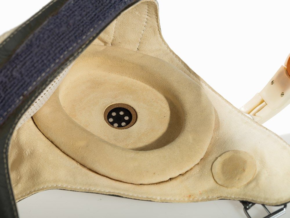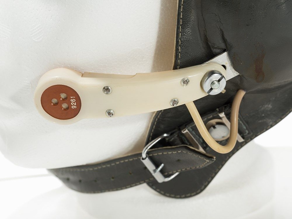 The microphone headset bears on the reverse of the leather collar the stamps with the inscription, date and numbering ‘??-3???59’ (= silk April 3, 59) and ‘1A51133’. The headset is in used but good condition. The dimensions are 20 x 25 x 28 cm.