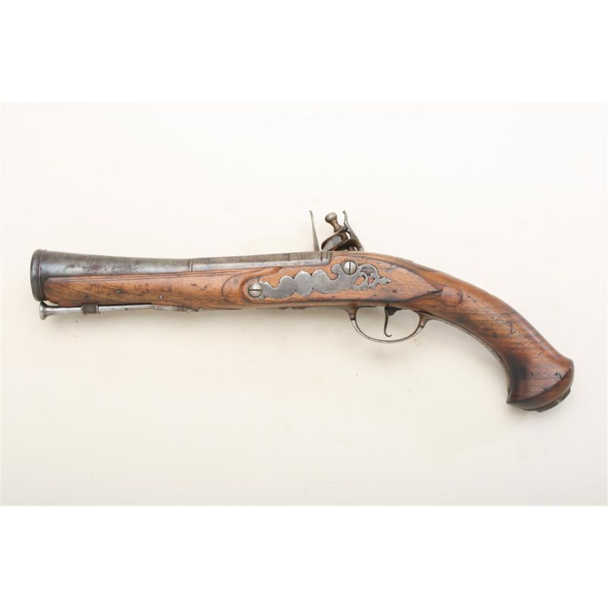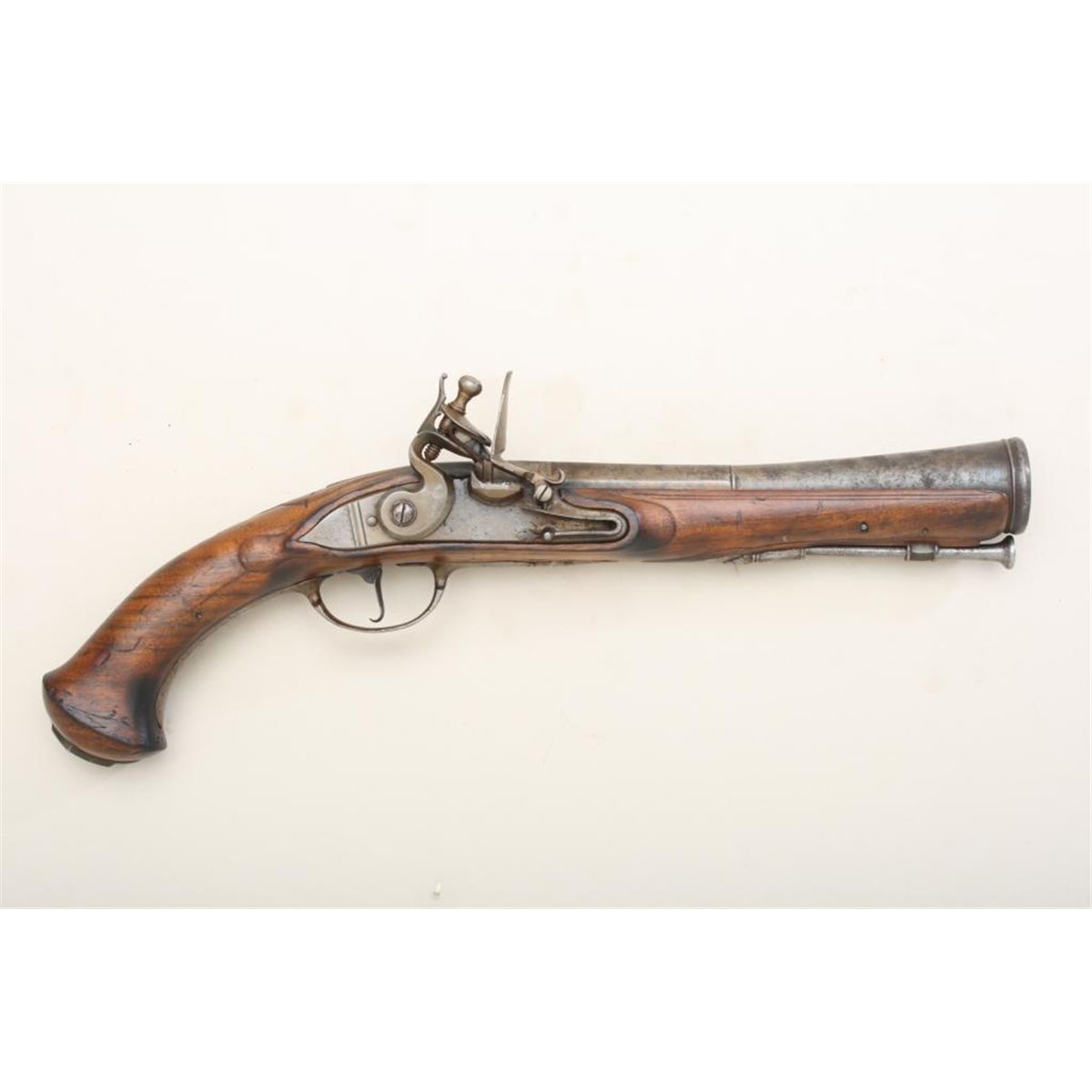 Mid 17th century blunderbuss pistol signed Mariano on barrel of Italian origin. Iron mounted, full stocked, barrel measures 8-1/4”. Pistol is 16” overall. The two-staged barrel is nearly 1-1/2” across the muzzle.The metal surfaces are in good condition showing a grey-brown patina finish. The stocks are good showing some light refinishing and some small restorations of wood in the forend. A very big and impressive blunderbuss pistol in its original flintlock configuration. Est: $1,500 - $3,000