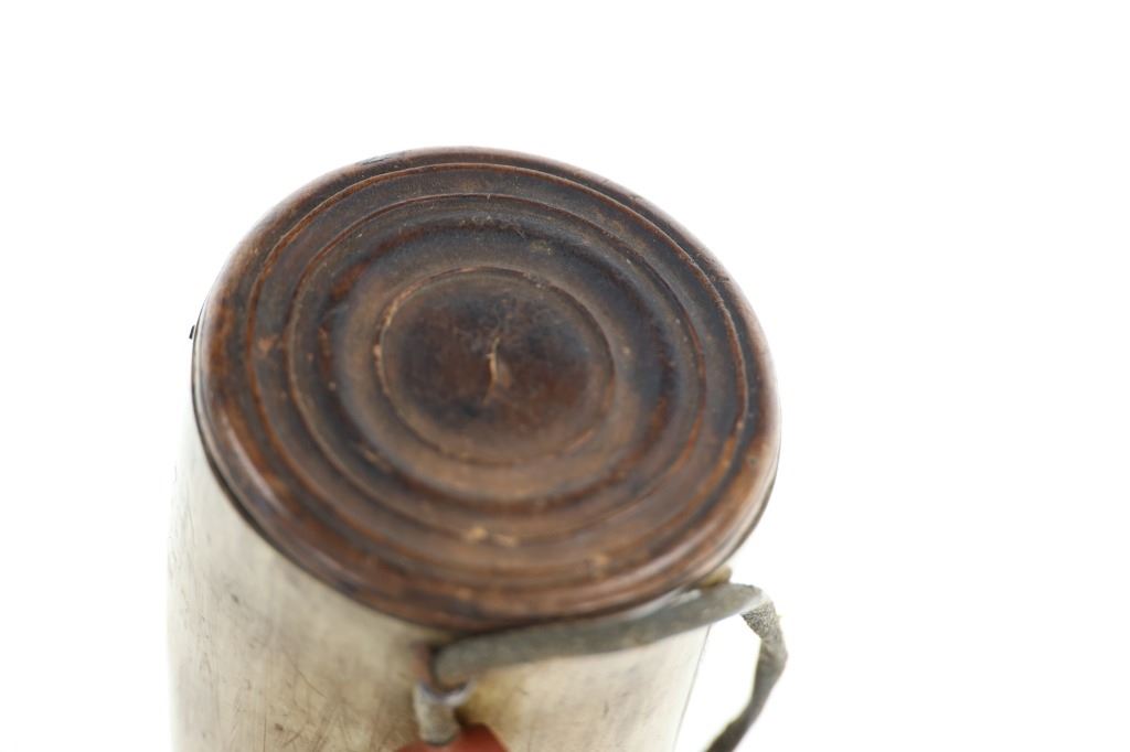 For your consideration is this Mid-1800s, steer horn powder horn with a rawhide shoulder strap. The powder horn shows a light brown color and features a slight curve. The strap is constructed from rawhide and has been tied around the powder horn acting as a shoulder strap. No marks or inscriptions are present. It shows good condition overall with some wear present from its age and use over the years, but no major signs of damage is noted. It measures 11" L x 2 1/2" W and weighs under 6 ounces.