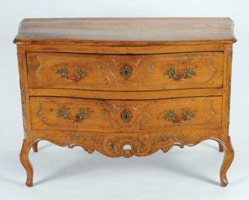 Mid 18th Century French Provincial Walnut Commode fitted two full length drawers above a pierced and carved apron, similar carved decoration to the canted corners, on shaped supports, w. 48"" - 121.9 cm.