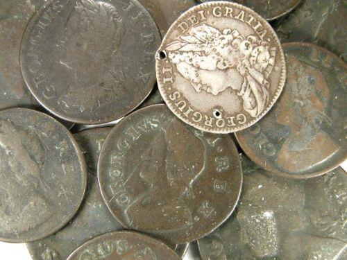 1743 Sixpence. Plus Half Penny: 1738, 1739, 1740 two pieces and 1744. Plus Farthing: 1735 two pieces, 1736, 1744 and 1754 two pieces. Total twelve pieces, Good to Fine, mostly VG and better, some with problems