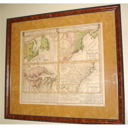 Four maps on one sheet: Newfoundland, Nova Scotia and New Brunswick - New York, New Jersey and Pennsylvania - Virginia and Maryland - Carolina and north Florida, based upon earlier maps by Herman Moll which were published in London. The counties, rivers and towns are clear, and well marked. The hand-coloring is very little faded from the years.