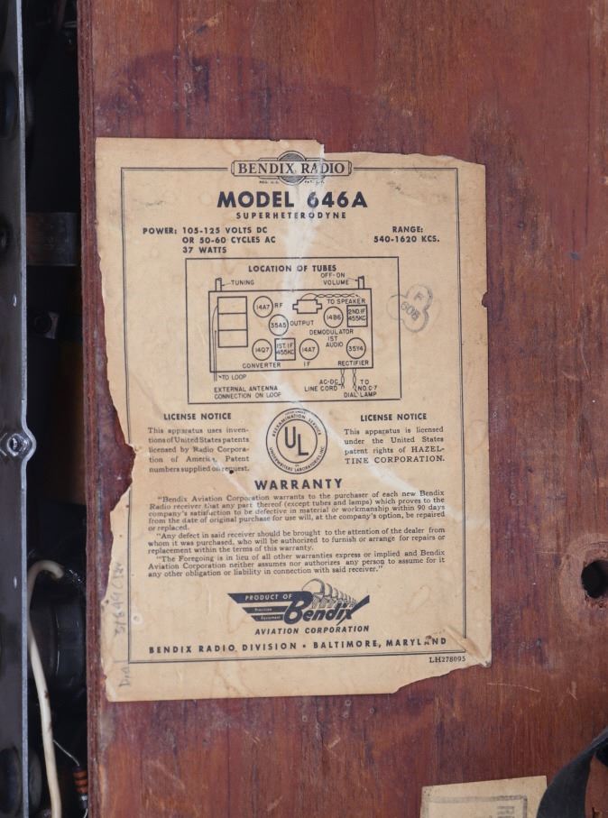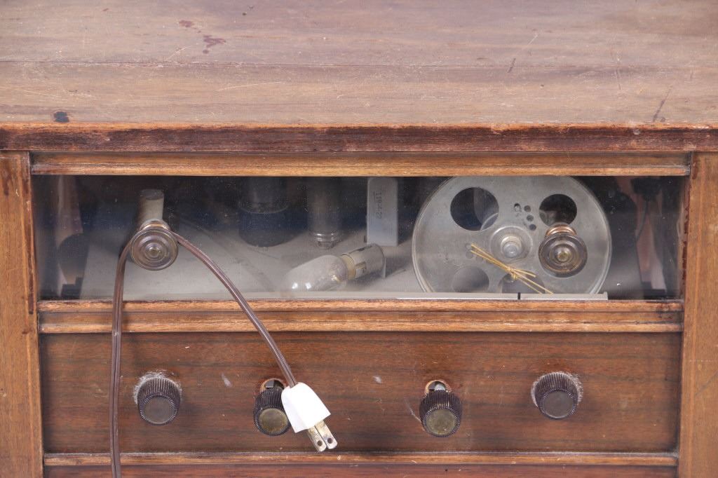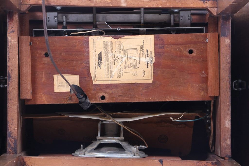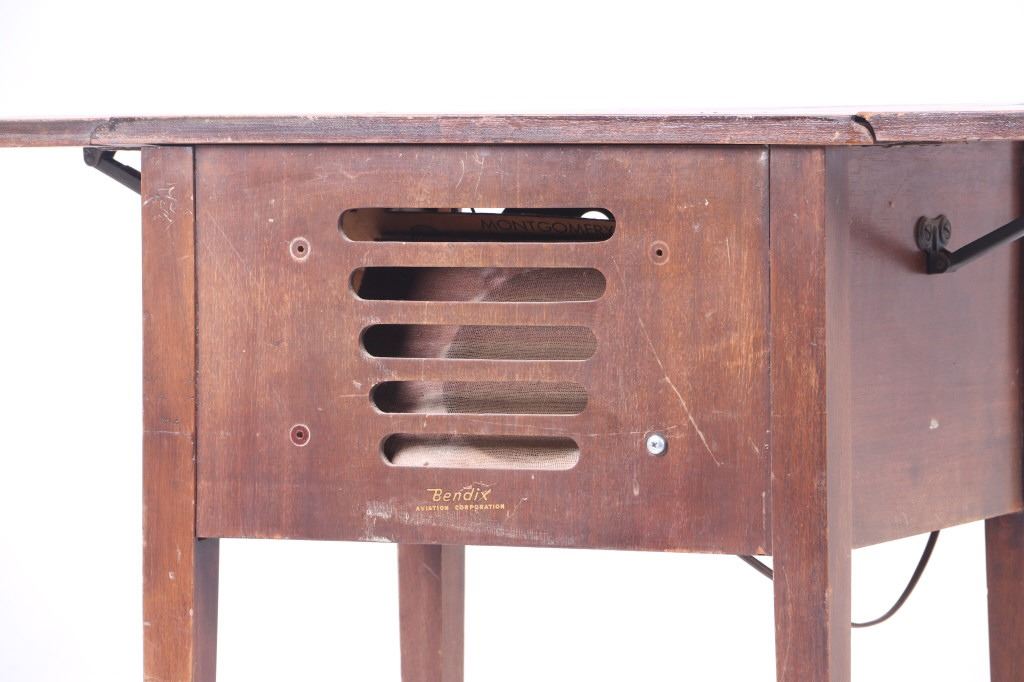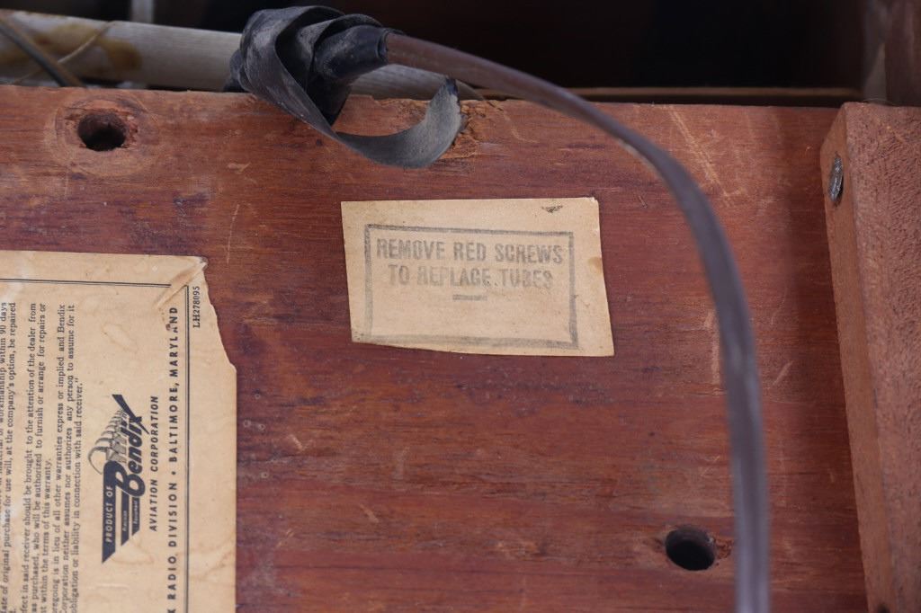 Featured in this lot we have a Bendix Aviation Corporation Radio originating from the bid 1900's. The Bendix Aviation Corporation was founded in 1929 and manufactured aircraft parts. The company was bought out in 1960 by the Allied Corporation. The Bendix Corporation is known for its radio's. This piece is set into a wooden table with knobs across the front. The front of the piece shows a clear panel across the front with light bulbs, wheels, and electronic radio parts. The piece is marked across the back reading "Bendix Aviation Corporation". The radio shows good condition overall with some light wear due to age. The piece measures 27 3/4" tall by 35 1/4" at the widest and 14" deep.