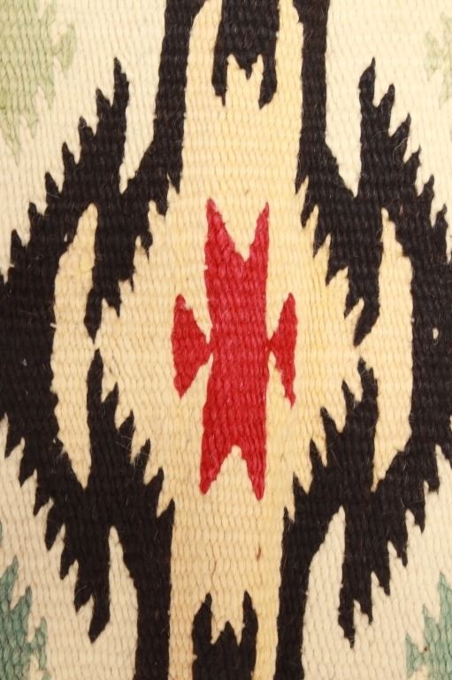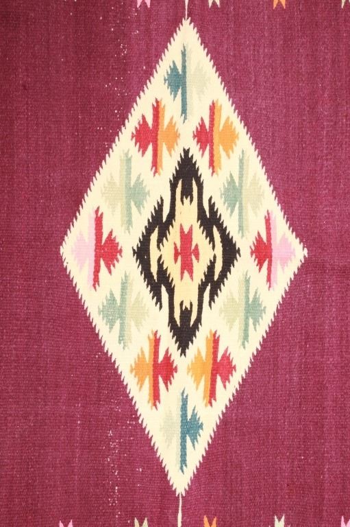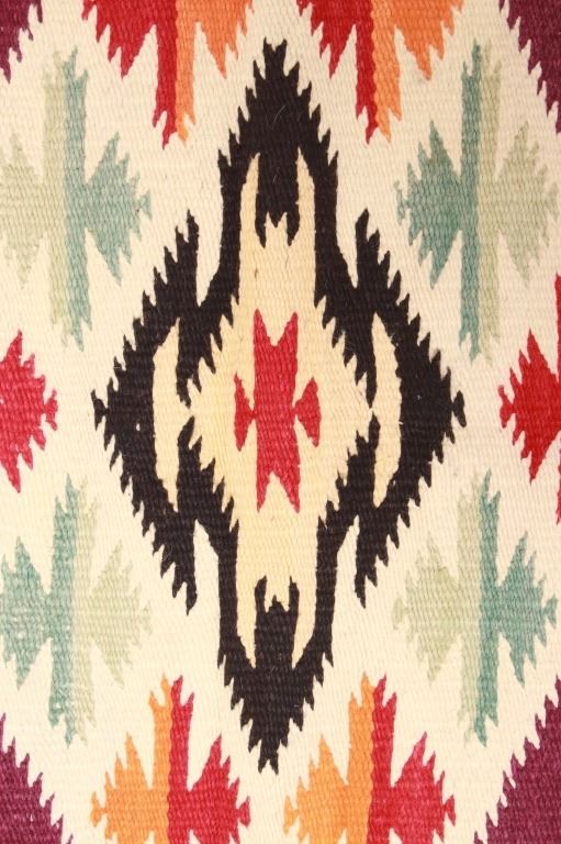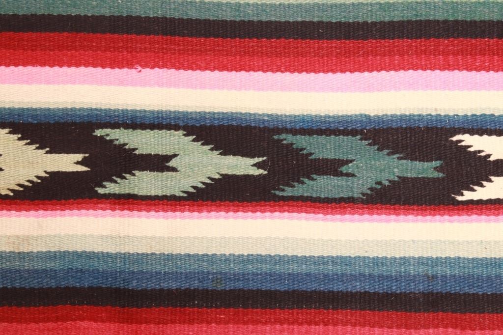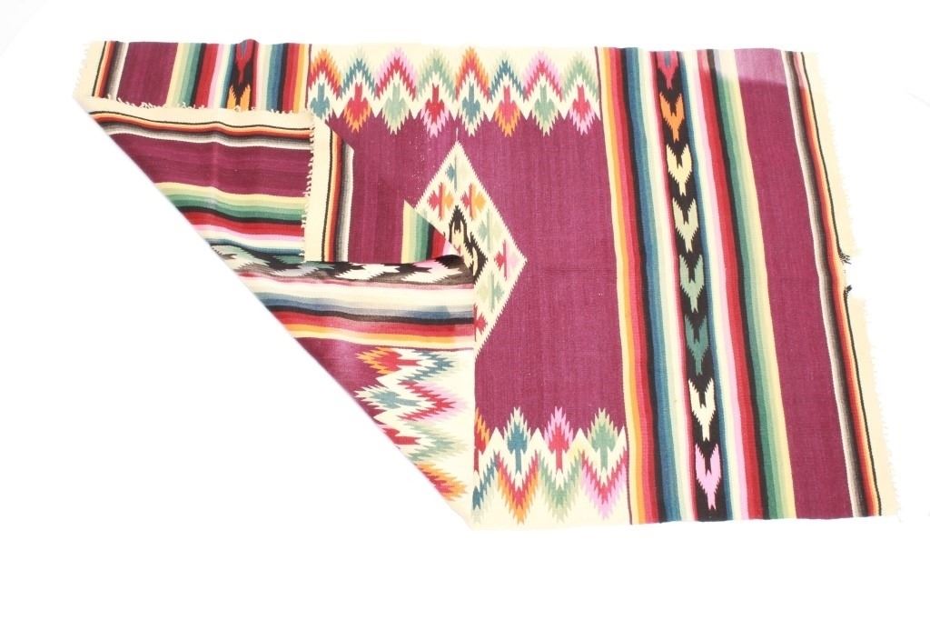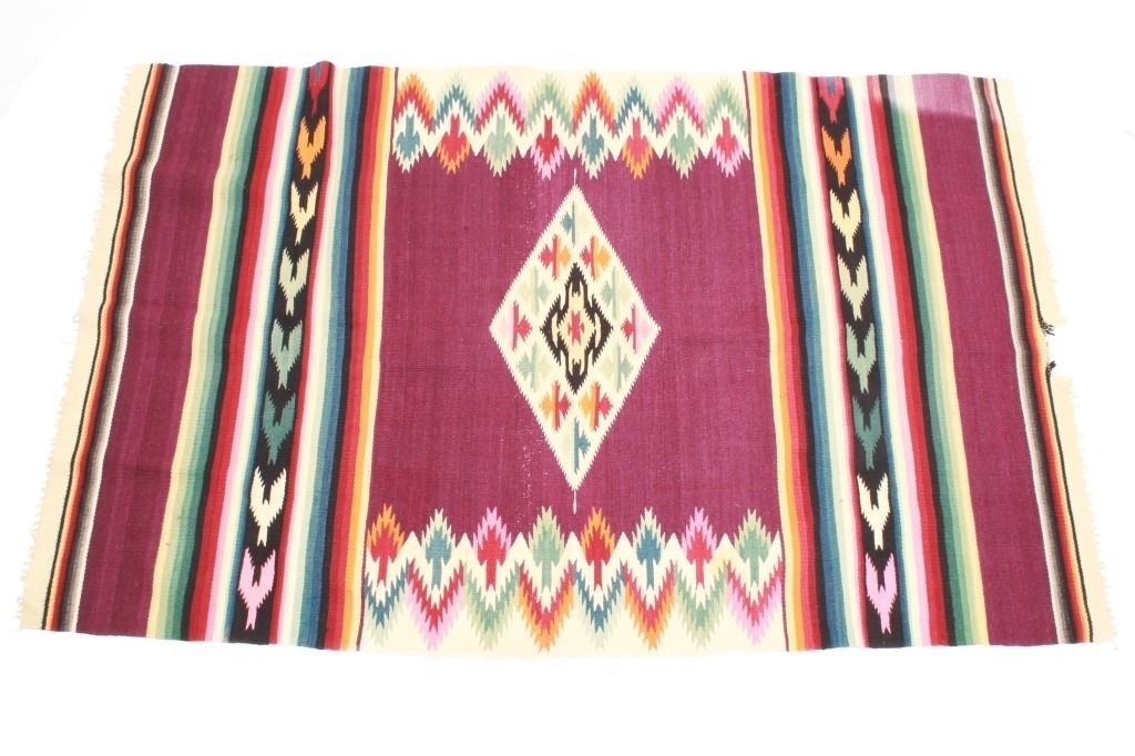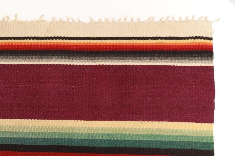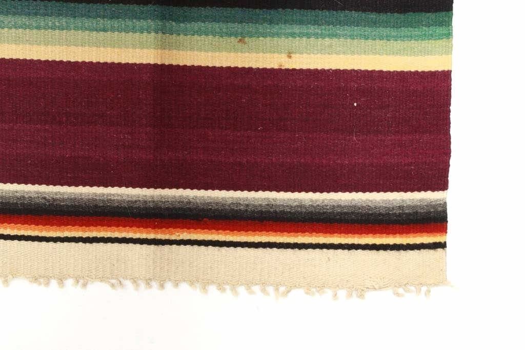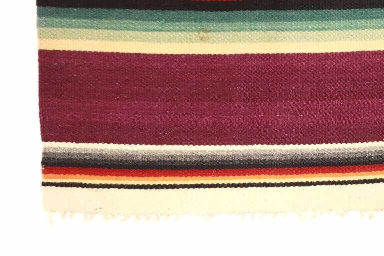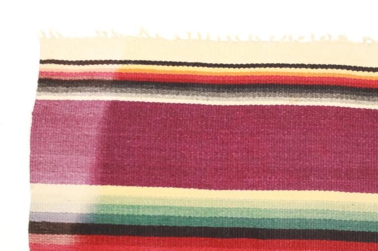 Featured in this lot is a wonderful 1930'-50's Mexican Saltillo medallion Zapotec woven rug or blanket. It shows a wonderful geometric medallion pattern in the center with multicolored striations going across the piece. The rug was made using 100% soft, fine, hand spun yarns. The tight hand-woven weave displays bright rich tones in the fine Saltillo pattern of the time-honored Zapotec style. The rug shows a wide gradient of colors across the rug, including red, purple, blue, orange, pink, white, black, grey, and turquoise. The rug is in good condition overall, with little to no signs of damage. It measures 54" wide by 85" long.