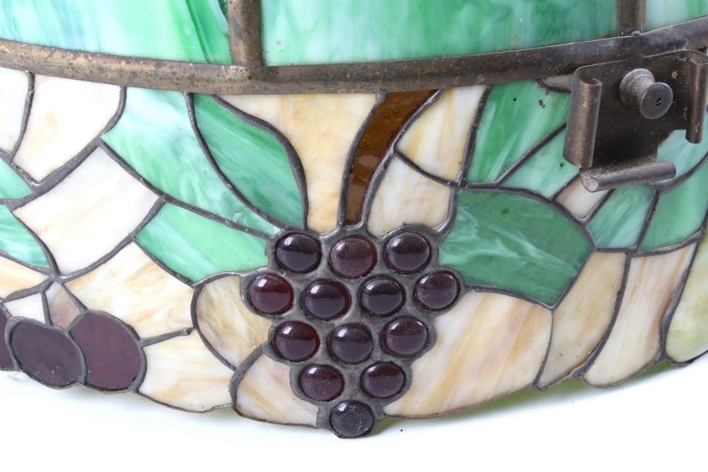 Featured in this lot we have a stained glass and brass fruit chandelier originating from the early to mid 1900's. The piece displays stained glass construction with designs of fruit and leaf patterns across the bottom. The top of the chandelier shows sloped glass with green and white mixed color patterns. The stained glass shows lead lining with brass across the top sections. The piece shows fair condition overall with some wear and signs of repair.