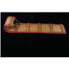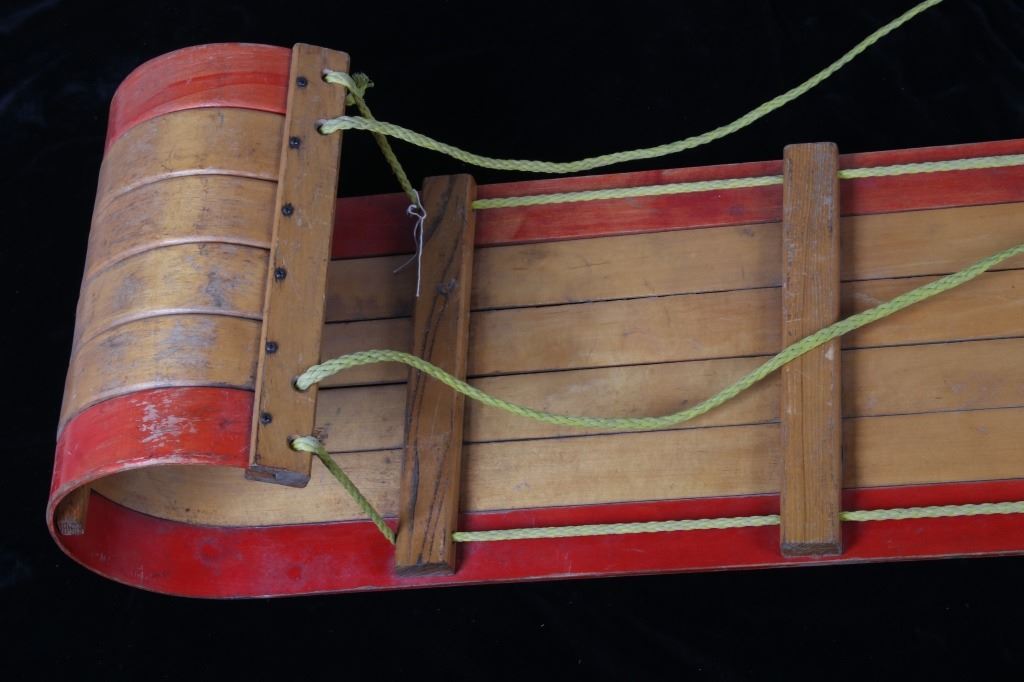For your bidding pleasure is this traditional wooden Toboggan from the mid 1900's. This is a good well crafted toboggan that can seat four and shows the outside plank of the toboggan and a nylon steering line. Toboggans are simple sleds which are usually made of parallel wood slats. These J-shaped sleds do not have runners, but can seat at least four people. Toboggans were the common mode of transportation by the Cree and Innu people of northern Canada. The measurements of this toboggan are 9 1/2" x 61" x 15 1/4".