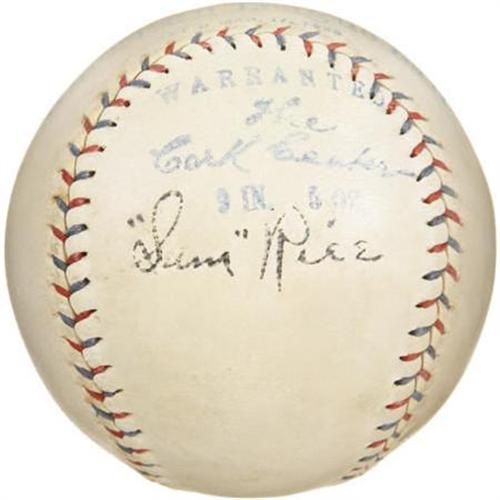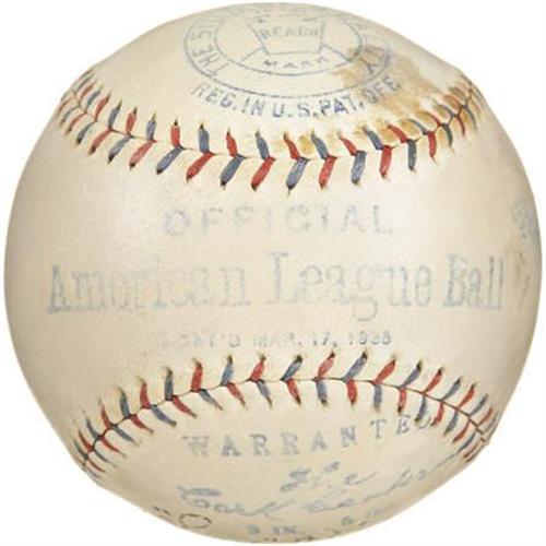 <B>Mid-1920's Sam Rice Signed Baseball.</B></I> The Ban Johnson stamping on this highly desirable red and blue stitched Official American League baseball allows us to date this offering definitively to the period prior to Ernest Barnard's 1928 assumption of the League presidency, suggesting a close proximity to the Washingon Senators' most glorious era. One of that club's most noteworthy stars, Hall of Fame outfielder Sam Rice, appears in 8/10 black fountain pen ink upon a side panel, providing the appearance of a $3,000+ single. We must confess that a chemical process has stripped the sphere of earlier neighbors to Rice, though this work has been done with such skill so as to be undetectable by the naked eye. Definitely a Senator worthy of your vote. <I>LOA from PSA/DNA. LOA from James Spence Authentication.</B></I><BR><BR><b>Shipping:</b> Balls, Pucks, etc., Small (<a target="_blank" href="http://www.heritageauctions.com/common/shipping.php">view shipping information</a>)
