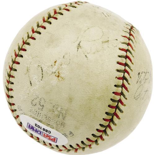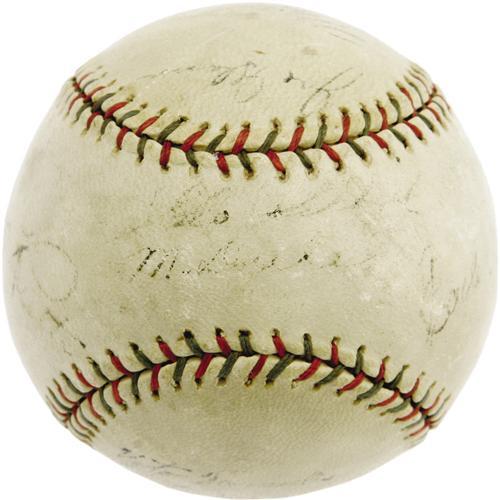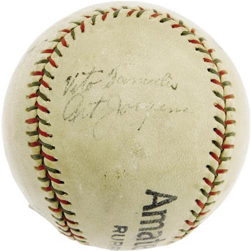 <B>Mid-1930's Lou Gehrig Signed Baseball.</B></I> A terrific opportunity to bring an example of this essential signature on a baseball into your collection at a price that won't break the bank. The Iron Horse offers a 7/10 side panel signature on this "Amateur League" ball, joined by eight other New York Yankees including Combs (3/10) and a secretarial Babe Ruth. Place the Gehrig signature alone on an official ball and it's a solid five-figure piece. And with the way that Lou's autographs continue to climb in value, this one may well reach that plateau one day soon. <I>LOA from PSA/DNA. LOA from James Spence Authentication.</B></I><BR><BR><b>Shipping:</b> Balls, etc. (<a target="_blank" href="http://www.heritageauctions.com/common/shipping.php">view shipping information</a>)