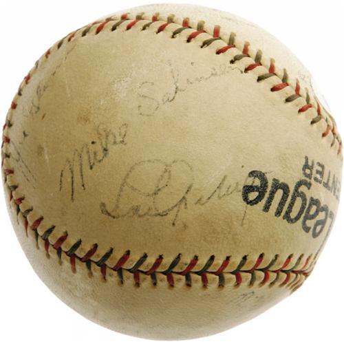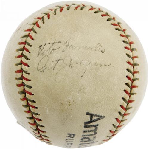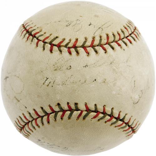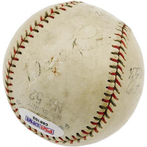 <B>Mid-1930's Lou Gehrig Signed Baseball.</B></I> A terrific opportunity to bring an example of this essential signature on a baseball into your collection at a price that won't break the bank. The Iron Horse offers a 7/10 side panel signature on this "Amateur League" ball, joined by eight other New York Yankees including Combs (3/10) and a secretarial Babe Ruth. Place the Gehrig signature alone on an official ball and it's a solid five-figure piece. And with the way that Lou's autographs continue to climb in value, this one may well reach that plateau one day soon. <I>LOA from PSA/DNA.</B></I> <BR><BR><B>Important notice:</B> Heritage usually auctions material at the rate of 200-250 lots per hour. On some occasions eBay Live bid software or the Internet may not be able to keep up with the pace of the auction. We recommend placing a realistic absentee bid now as insurance to avoid disappointment. Occasionally the auctioneer may eliminate or reject an eBay Live bid, and the auctioneer may also reopen a lot after the close of the eBay live bidding (usually because we missed an audience bid), and may reject your bid even if it shows you as the winning bidder. By bidding via eBay Live, you agree that Heritage may award the lot to another bidder at its sole discretion under the circumstances described above or any other reasonable circumstances. Since eBay bids are not shown to us until we open the lot on the floor, we treat those bids just like floor bids. In most cases the floor responds before the eBay bid is presented to us, due to Internet lag time, so for consistency we have made it a policy that floor bids are always considered first over tie eBay live bids. Also please note that all Heritage lots purchased through eBay Live carry a 22.5% Buyer's Premium. Please make sure you read the Terms and Conditions before you bid. This lot is being auctioned in conjunction with a live floor auction by Heritage Galleries & Auctioneers. All final auction and invoice information will be supplied by Heritage Galleries & Auctioneers, and all other information should be considered preliminary. Lot:19387 <BR><BR><B>Winning Notification and Billing:</B> After the FINAL session in this auction is complete, Heritage will send e-mail and snail mail invoices. This process normally takes several days. All final auction and invoice information will be supplied by Heritage Galleries & Auctioneers, and all other information should be considered preliminary. <BR><BR>This auction will be conducted on a live auction floor and over the Internet through eBay Live. If you choose to place an absentee bid, please take a moment to <font color='#0000ff'><u><a href='http://pages.ebay.com/liveauctions/help/before/laabsentee.html'>learn how eBay Live absentee bidding works</a></u></font><font color='#000000'>
