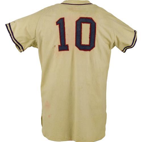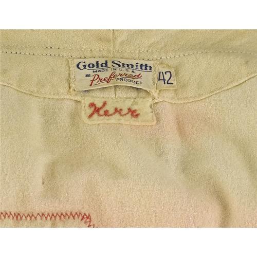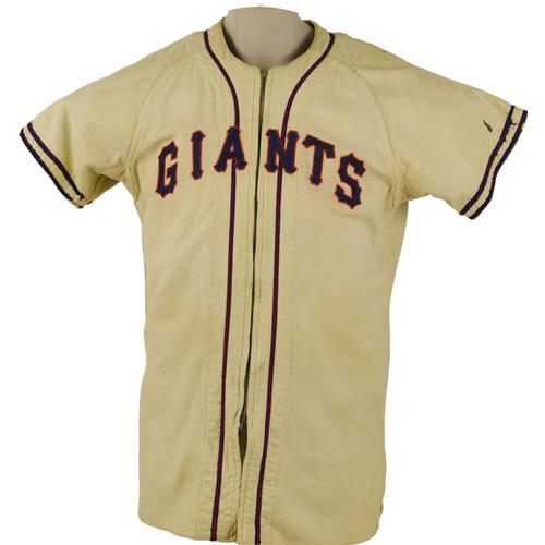 <B>Mid-1940's Buddy Kerr Game Worn Jersey.</B></I> Direct from the Polo Grounds comes this heavy white flannel gamer, worn in action by the New York Giants' star shortstop. Once upon a time, our consignor's family had the entire Giants squad, after writing to the team and asking if they might donate their used uniforms for use by his high school team, a favor that was granted. But after the gamers of Ott, Lombardi, Medwick and the rest had been used by the schoolkids, they were put into storage in a damp barn. This is the only one that survived. The silver lining of this sad tale is the fine example offered here, with "Giants" in blue and red felt on the chest, and Kerr's number "10" on verso. "Kerr" is chainstitched in red on a felt swatch below the "Goldsmith [size] 42" collar tagging. The zipper on front is broken and the jersey shows expected wear and light staining, but it still presents beautifully as one of the last in this color scheme before the switch to the Halloween colors that survive to this day. <I>LOA from Lou Lampson.</B></I> <BR><BR><B>Important notice:</B> Heritage usually auctions material at the rate of 200-250 lots per hour. On some occasions eBay Live bid software or the Internet may not be able to keep up with the pace of the auction. We recommend placing a realistic absentee bid now as insurance to avoid disappointment. Occasionally the auctioneer may eliminate or reject an eBay Live bid, and the auctioneer may also reopen a lot after the close of the eBay live bidding (usually because we missed an audience bid), and may reject your bid even if it shows you as the winning bidder. By bidding via eBay Live, you agree that Heritage may award the lot to another bidder at its sole discretion under the circumstances described above or any other reasonable circumstances. Since eBay bids are not shown to us until we open the lot on the floor, we treat those bids just like floor bids. In most cases the floor responds before the eBay bid is presented to us, due to Internet lag time, so for consistency we have made it a policy that floor bids are always considered first over tie eBay live bids. Also please note that all Heritage lots purchased through eBay Live carry a 22.5% Buyer's Premium. Please make sure you read the Terms and Conditions before you bid. This lot is being auctioned in conjunction with a live floor auction by Heritage Galleries & Auctioneers. All final auction and invoice information will be supplied by Heritage Galleries & Auctioneers, and all other information should be considered preliminary. Lot:19660 <BR><BR><B>Winning Notification and Billing:</B> After the FINAL session in this auction is complete, Heritage will send e-mail and snail mail invoices. This process normally takes several days. All final auction and invoice information will be supplied by Heritage Galleries & Auctioneers, and all other information should be considered preliminary. <BR><BR>This auction will be conducted on a live auction floor and over the Internet through eBay Live. If you choose to place an absentee bid, please take a moment to <font color='#0000ff'><u><a href='http://pages.ebay.com/liveauctions/help/before/laabsentee.html'>learn how eBay Live absentee bidding works</a></u></font><font color='#000000'>