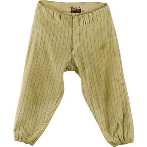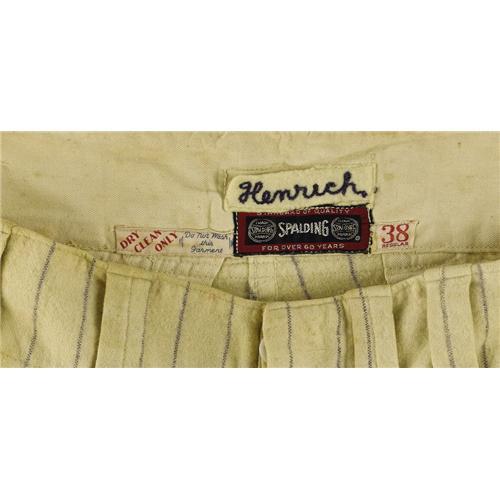 <B>Mid-1940's Tommy Henrich Game Worn Pants.</B></I> More Hall of Fame pinstriped flannel for the legions of Yankees collectors in our Heritage clientele. "Old Reliable" compiled a perfect four and nothing World Series record during his eleven seasons in the Bronx, while earning five All-Star nods and the adoration of Big Apple baseball fans. These pants saw action in the House that Ruth Built before being reincarnated in the minors along with the Rizzuto and Stirnweiss jerseys also offered in this auction. Strong wear is to be expected for such a long life, with team repairs and staining but no damage that is particularly distracting to the eye. A felt swatch in the waistband is embroidered "Henrich" in navy thread, and is placed above the "Spalding" manufacturer's label. "Dry Clean Only" and size "38 Regular" tags frame it on either side. Return to the days when Tommy and Joe ruled the Bronx outfield with the purchase of this important relic. <I>LOA from Lou Lampson.</B></I> <BR><BR><B>Important notice:</B> Heritage usually auctions material at the rate of 200-250 lots per hour. On some occasions eBay Live bid software or the Internet may not be able to keep up with the pace of the auction. We recommend placing a realistic absentee bid now as insurance to avoid disappointment. Occasionally the auctioneer may eliminate or reject an eBay Live bid, and the auctioneer may also reopen a lot after the close of the eBay live bidding (usually because we missed an audience bid), and may reject your bid even if it shows you as the winning bidder. By bidding via eBay Live, you agree that Heritage may award the lot to another bidder at its sole discretion under the circumstances described above or any other reasonable circumstances. Since eBay bids are not shown to us until we open the lot on the floor, we treat those bids just like floor bids. In most cases the floor responds before the eBay bid is presented to us, due to Internet lag time, so for consistency we have made it a policy that floor bids are always considered first over tie eBay live bids. Also please note that all Heritage lots purchased through eBay Live carry a 22.5% Buyer's Premium. Please make sure you read the Terms and Conditions before you bid. This lot is being auctioned in conjunction with a live floor auction by Heritage Galleries & Auctioneers. All final auction and invoice information will be supplied by Heritage Galleries & Auctioneers, and all other information should be considered preliminary. Lot:19659 <BR><BR><B>Winning Notification and Billing:</B> After the FINAL session in this auction is complete, Heritage will send e-mail and snail mail invoices. This process normally takes several days. All final auction and invoice information will be supplied by Heritage Galleries & Auctioneers, and all other information should be considered preliminary. <BR><BR>This auction will be conducted on a live auction floor and over the Internet through eBay Live. If you choose to place an absentee bid, please take a moment to <font color='#0000ff'><u><a href='http://pages.ebay.com/liveauctions/help/before/laabsentee.html'>learn how eBay Live absentee bidding works</a></u></font><font color='#000000'>