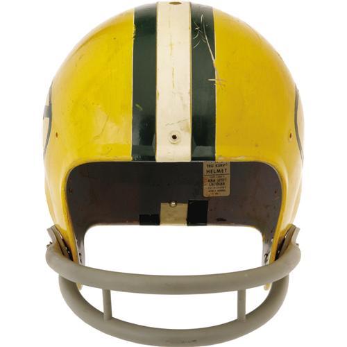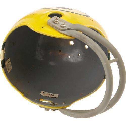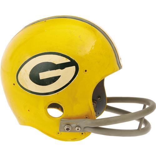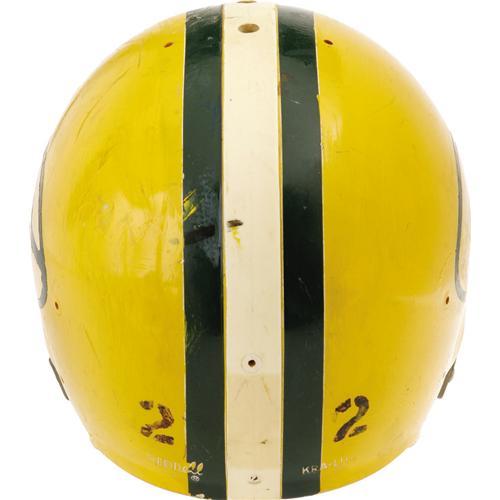 <B>Mid-1960's Elijah Pitts Game Worn Helmet.</B></I> The owner of the Super Bowl's first rushing touchdown and Green Bay Packers Hall of Fame member put exceptional use into this classic yellow helmet during his service to the great Vince Lombardi. The outside of the shell remains in perfect, well used 1960's condition, but the entire inner shell contents (suspension webbing, neck webbing, crown donut, jaw pads, and forehead snubber) are no longer present. The inner shell does sport dual markered number "22" adjacent to the right ear hole, however, along with an "RC65" recon sticker. The outer shell exhibits original layered "G" side logos and original stamping, and the lower back features a stenciled "22" in proper location, size, and font. The green stripes have factory stamping of "Riddell" and "Kralite." The BD-9, 2-bar facemask is from the late 1960's and is affixed with later period screws and housing peripherals. Any deviations from perfection have little effect upon display value, however, and none whatsoever on the tremendous historical relevance. <I>LOA from Lou Lampson.</B></I> <BR><BR><b>Shipping:</b> Miscellaneous Collectibles, Larg (<a target="_blank" href="http://www.heritageauctions.com/common/shipping.php">view shipping information</a>)