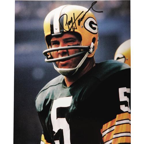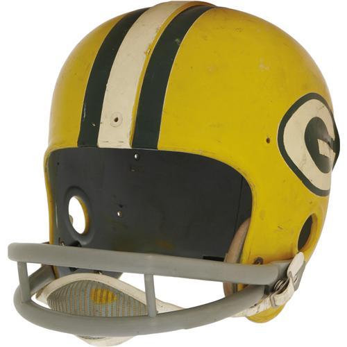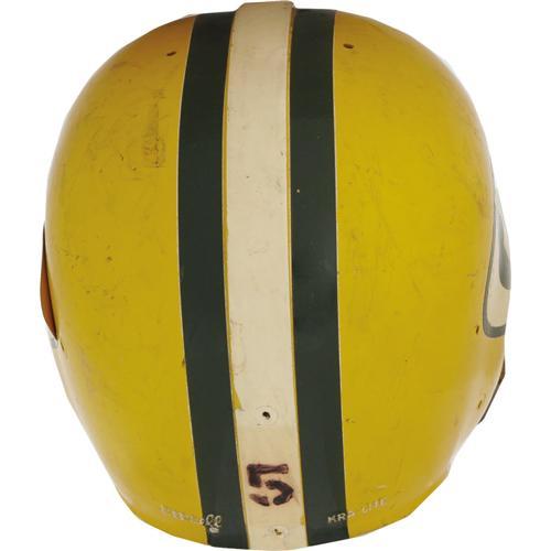 <B>Mid-1960's Paul Hornung Game Worn Helmet with Photo Match.</B></I> The Notre Dame Heisman Trophy winner entered the National Football League as the number one overall pick, joining a Green Bay Packers team he would help lead to four Championships including the first Super Bowl in 1967. As the "Thunder" to Jim Taylor's "Lightning," Hornung helped compose Lombardi's unstoppable ground game that tore apart opposing defenses throughout the era of this incredible helmet's use. For legions of Lambeau Field fans, this battered headgear represents the essence of what it is to be a Green Bay Packer, and we're pleased to have the opportunity to offer it to the collecting community.<BR><BR> The helmet shell remains intact but the entire inner contents (suspension webbing, crown donut, jaw pads, and snubber) have been removed. The interior does sport two markered number "5" identifiers however, as well as a "RC-65 Riddell" recon sticker. The exterior shell has been definitively photo matched to one of the most famous photographs of Hornung in uniform. Note the abrasions at the seven o'clock area of the left "G" logo, and the thin white vertical scuff on the green center striping above Hornung's right eye. Both "G" logos are original as, is the striping. The stenciled number "5" on the back of the center stripe is likewise original, and both green stripes have been factory stamped. The 2-bar "BD9" facemask is from a later period, as are the bolts and housing peripherals. A mid-1960's "Riddell" chinstrap is here as well. The helmet still displays exceedingly well despite the lack of interior padding. It is probably one of the last helmets used by Hornung, which coincides, of course, with the greatest years of the Packers dynasty. A piece worthy of display at Canton, or in the finest private football collections. Included in the lot is the 8x10" photograph of Hornung wearing this helmet, signed in 10/10 black sharpie. <I>LOA from Lou Lampson.</B></I><BR><BR><b>Shipping:</b> Miscellaneous Collectibles, Larg (<a target="_blank" href="http://www.heritageauctions.com/common/shipping.php">view shipping information</a>)