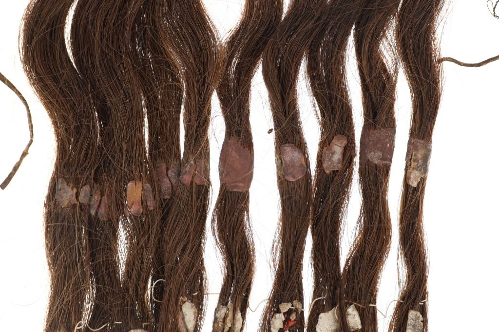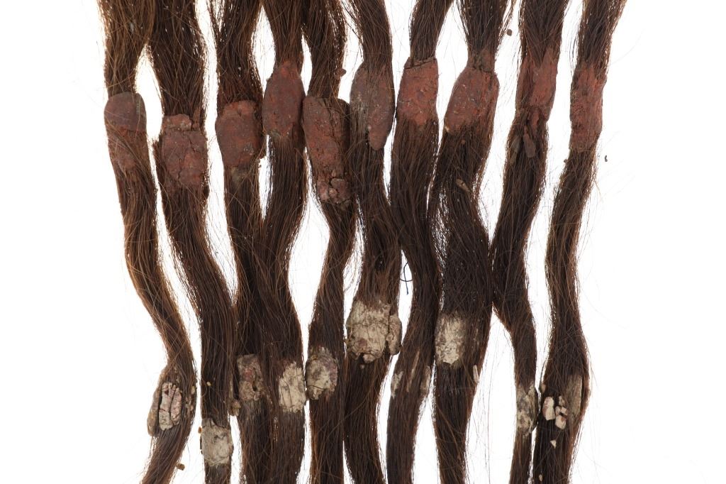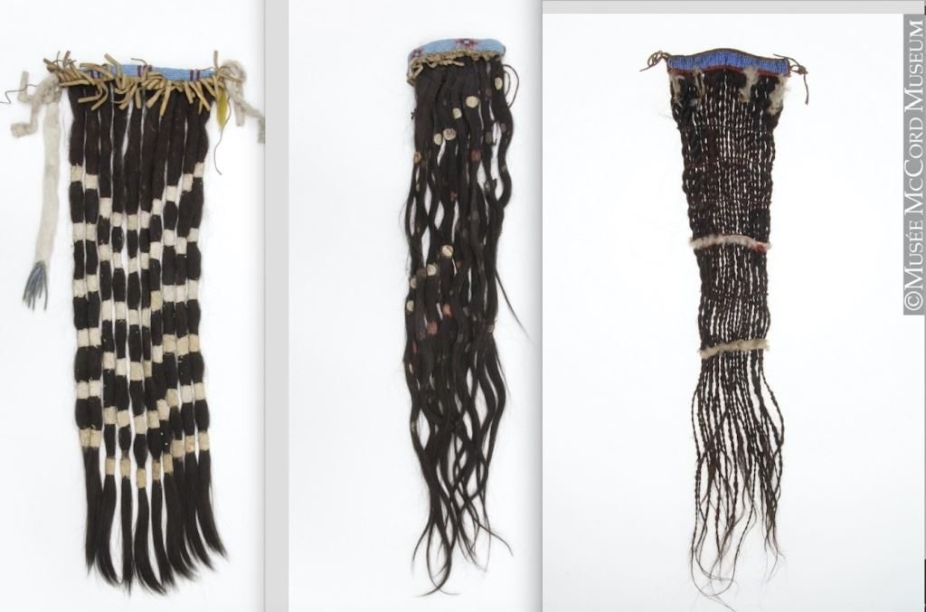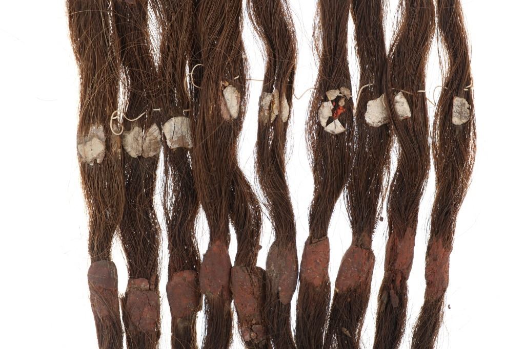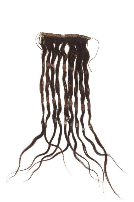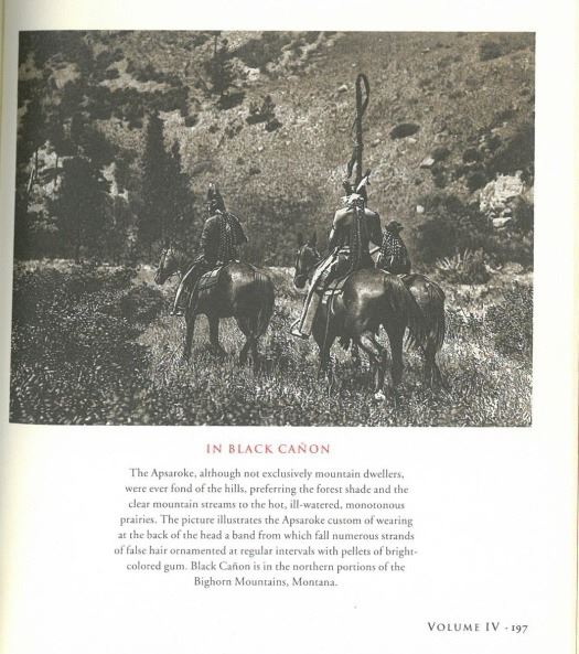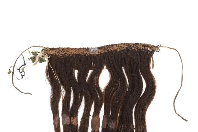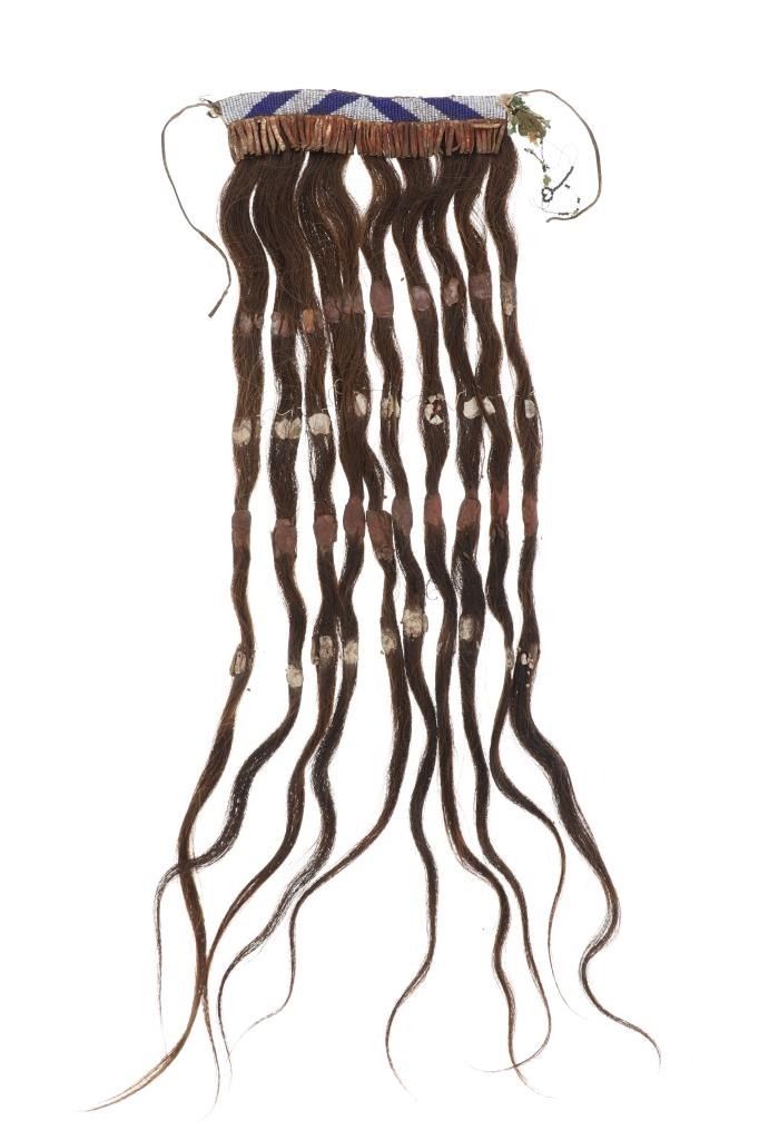 For additional examples see piece in the Musee McCord Museum, Apsaalooke (Crow/Absaroke) Man’s hair ornament/hair extensions from the Frank M. Covert and George Heye collections on display in the Smithsonian National Museum of the American Indian, Bates, Craig, Bonnie Kahn and Benson Lanford, The Cheyenne/Arapaho Ledger Book from the Pamplin Collection, Dr. Robert Pamplin, Jr, publisher, 2003, fig. 29, p. 187, and plate ST, p. 242, for a pictographic drawing showing a Cheyenne warrior attacking a Crow who is wearing a hair extension. Edward S. Curtis photographed three Crow Indians on horseback wearing these ornaments in The North American Indian, vol. 4, plate 136, In Black Canyon (Canon) which has the caption mentioning the pieces as, “The picture illustrates the Apsaroke custom of wearing at the back of the head a band from which fall numerous strands of false hair ornamented at regular intervals with pellets of bright-colored gum." A scan of “The North American Indian The Complete Portfolios of Edward S. Curtis”1997 Taschen, Volume IV page 197 is shown for reference as well. As well as the example sold by Heritage Auction as A Crow Man’s Hari Extension circa 1885 in 2007 for $3,107.00.