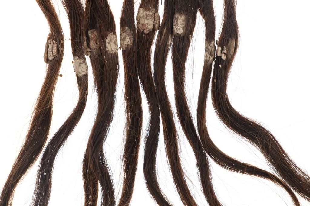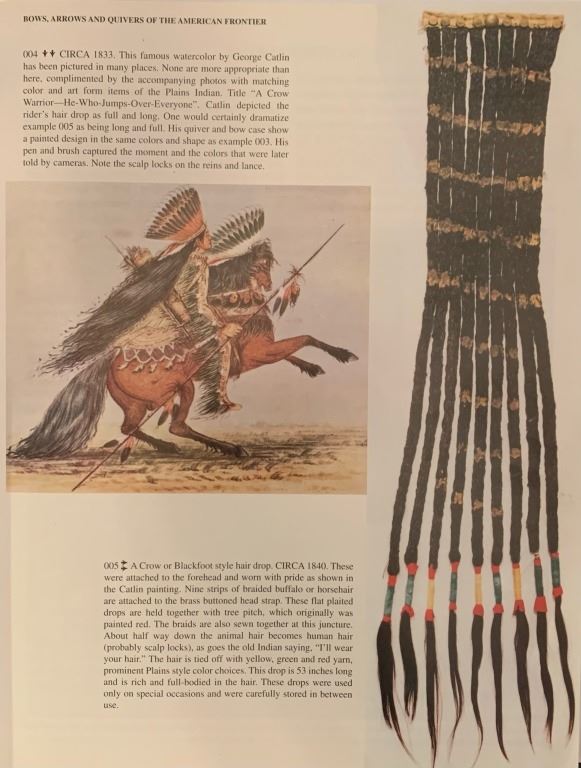 Hair extensions or ornaments were documented by the works of George Catlin in circa 1833 as shown in the image titled, “A Crow Warrior – He-Who-Jumps-Over-Everyone” which depicts dramatized flowing hair extensions running down the warriors back (image shown in the description for example). Our example is very similar to the example in “Bows, Arrows & Quivers of the American Frontier” by John Baldwin 1999 on page 3 which shows the Catlin images (004) as well as 005, “A Crow or Blackfoot style hair drop. CIRCA 1840” (a copy of the cover and the page in Baldwin’s book are shown for example).