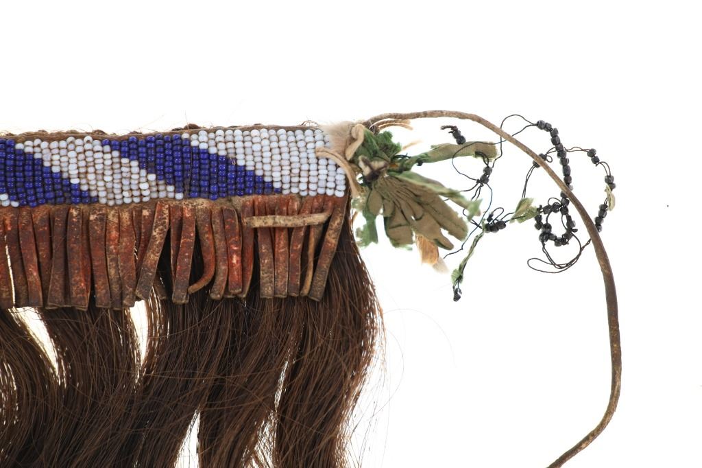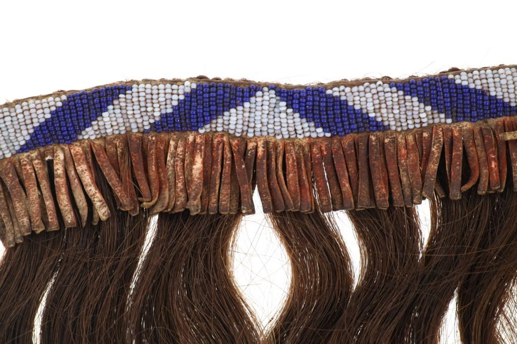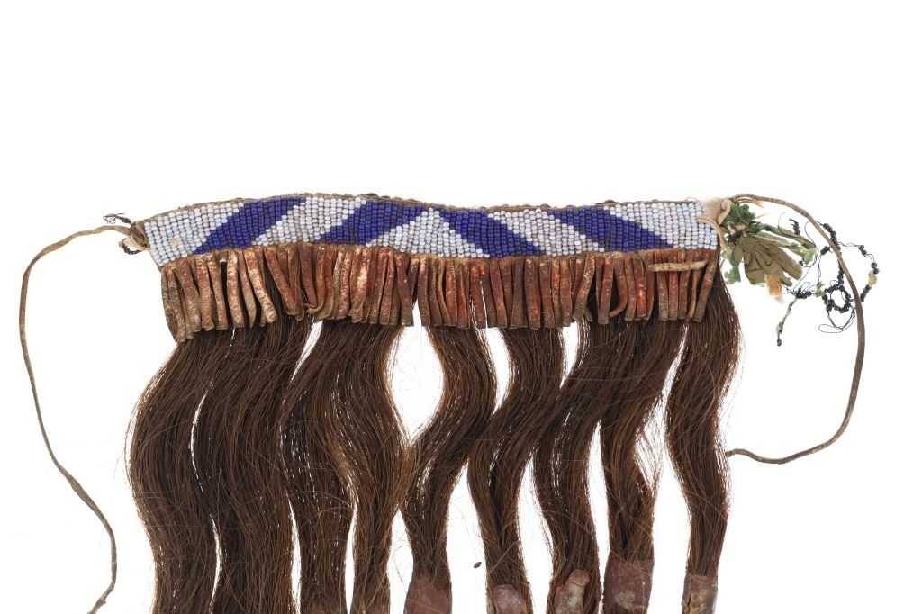 This is a fabulous mid-to-third-quarter 19th Century beaded warrior hair extensions from the Crow of Montana, ex-St. Paul, Minn. Museum collection. These hair ornaments or extensions were worn by warrior men, attached to the forehead and worn over their head and down their neck and back. This example exhibits an Indian tanned hide browband section with petit 19th Century early glass trade seed beads in a geometric pattern sewn with sinew with colors of greasy white and cobalt. Below beadwork are hand cut fringes with a deep red ocher / ochre dye paint. There are ten thick bundles of horse tail or human hair strands with daubs of pine tree pitch in alternating bands running down the separate locks colored with vermillion to give the red coloring and possibly a white clay. Truly an exceptionally scarce Crow (Apsaalooke or Absaroka) hair ornament from the Indian Wars era. Provenance: This is from the ex-Steve and Aninta Scherer California collection, who acquired this at a St. Paul, Minnesota Museum deaccession auction.