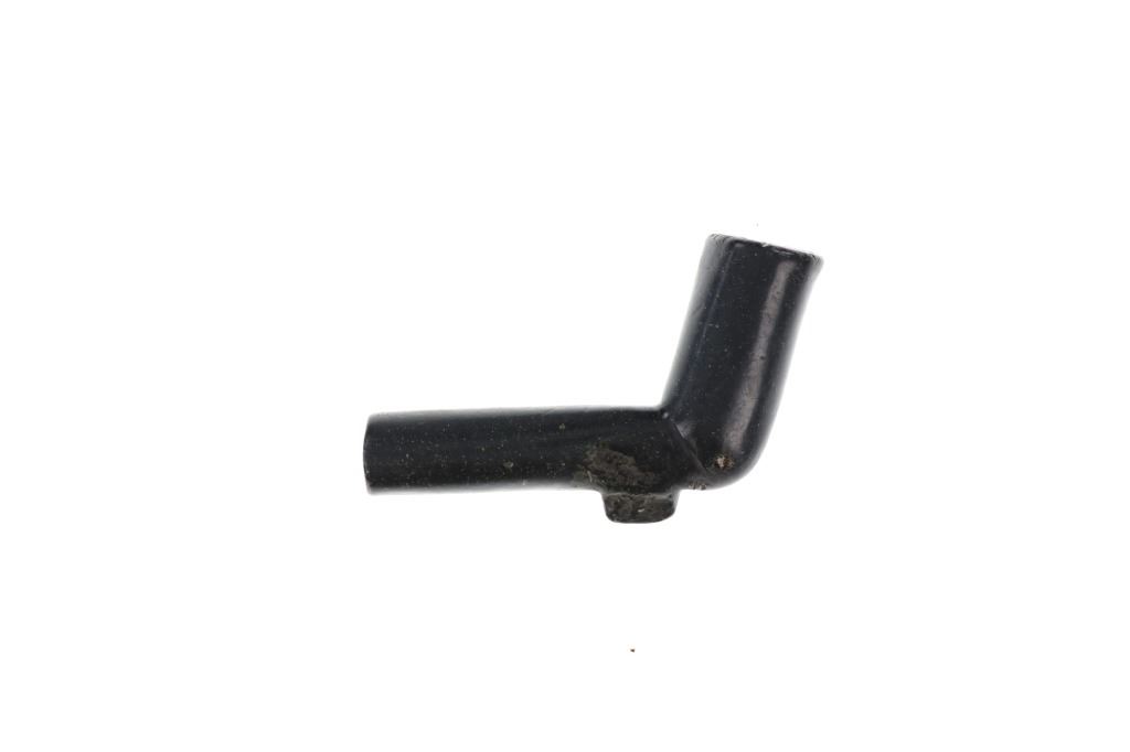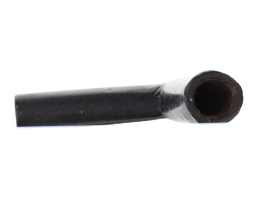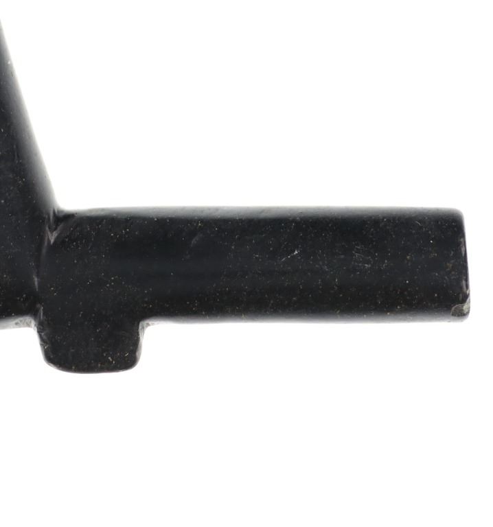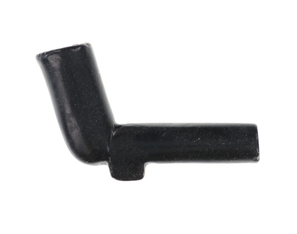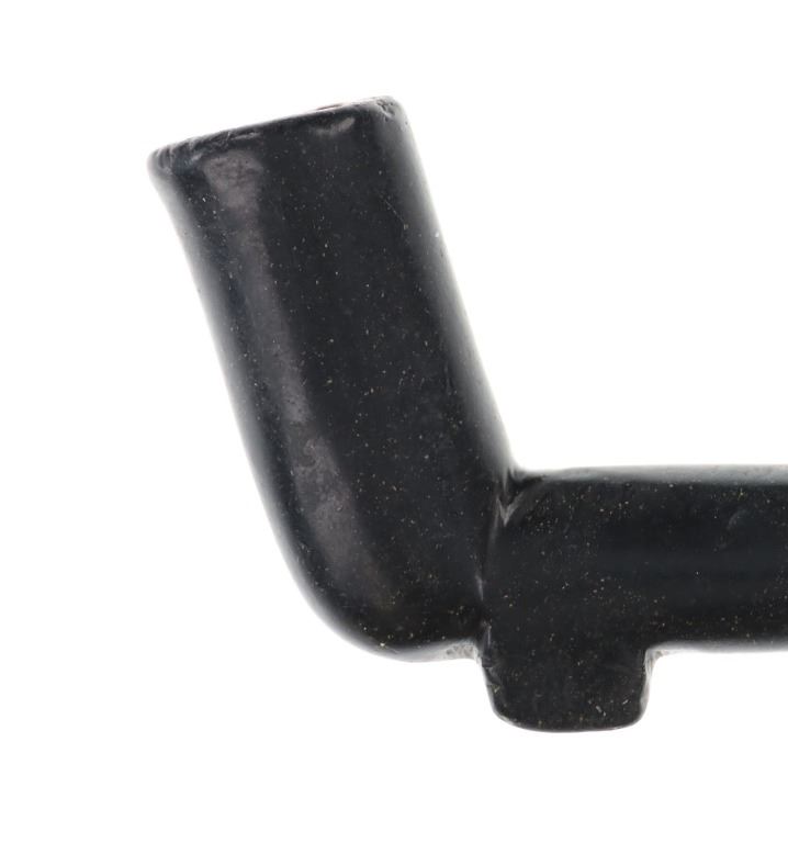 The lot features an original steatite carved elbow pipe from the Eastern Plains Native American Indians dating to the mid-19th Century from the Sundog Bruce VanLandingham collection. The piece shows an elbow pipe pattern with rounded tube like pipe bowl stem with a slightly tilted bowl which is larger in diameter and tapers out slightly. Beneath the stem area is a small keel or fin. The pipe has a dark black to charcoal coloring with slight speckled finish of almost yellow and small metal inclusion on one side. Provenance: From the renowned Sundog Fine Art Bozeman, Montana collection and acquired by Bruce VanLandingham. Bruce VanLandingham was a pillar in the American Indian collecting community and a respected expert. Along with being an avid collector Bruce also was the sole owner of Sundog Fine Art Gallery in Bozeman which was both part museum and gallery. Measures 3”L by 2”H by 3/4”W.